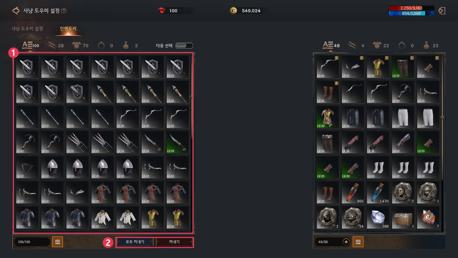 ① 사냥 도우미를 통해 획득한 아이템은 ‘사냥 도우미 인벤토리’에 저장됩니다.