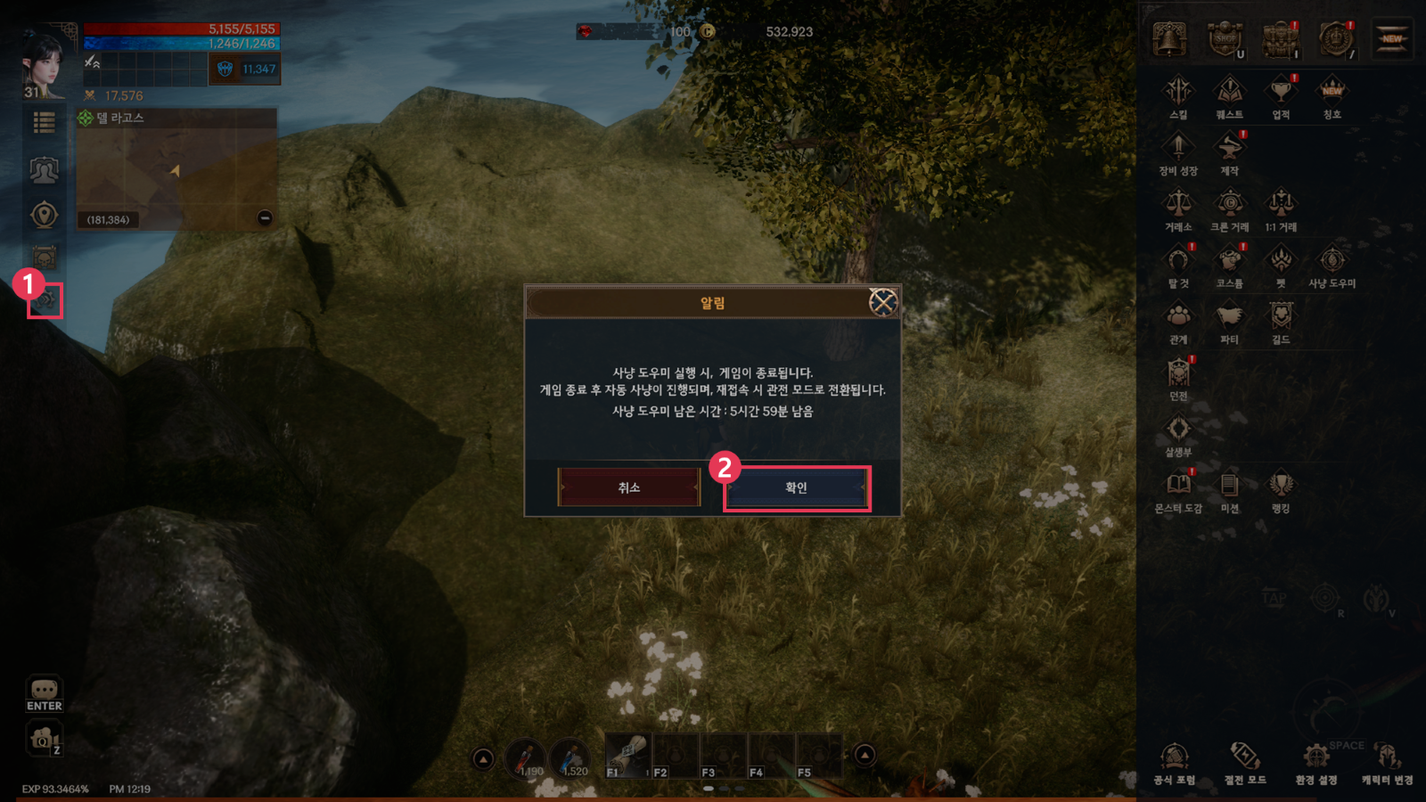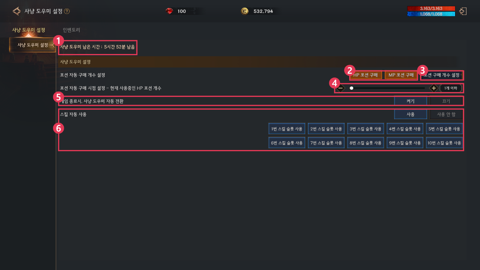 ① 사냥 도우미 남은 시간을 확인할 수 있습니다.
