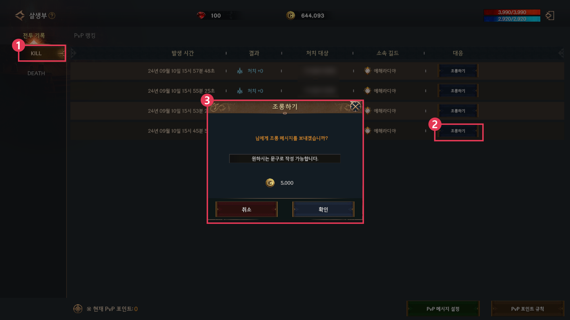 ② [조롱하기] 버튼을 선택하여 자신이 PK한 상대를 대상 당 1회 조롱할 수 있습니다.