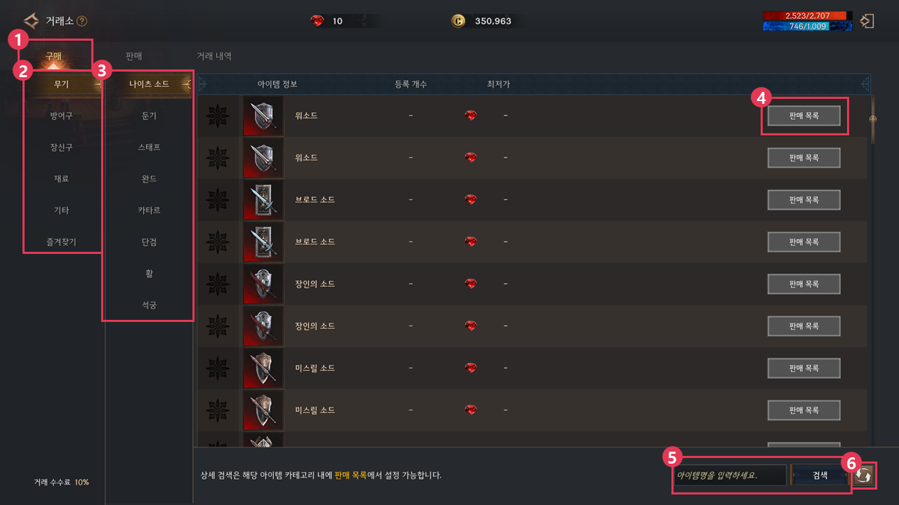 ⑤ 우측 하단의 원하는 아이템 이름을 입력하고 우측의 검색을 선택하면 해당 아이템과 관련된 목록이 노출됩니다.