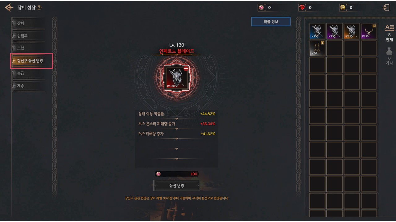 ▹ 130레벨 장비의 서브 옵션을 ‘장비 옵션 변경’ 메뉴에서 변경할 수 있습니다.