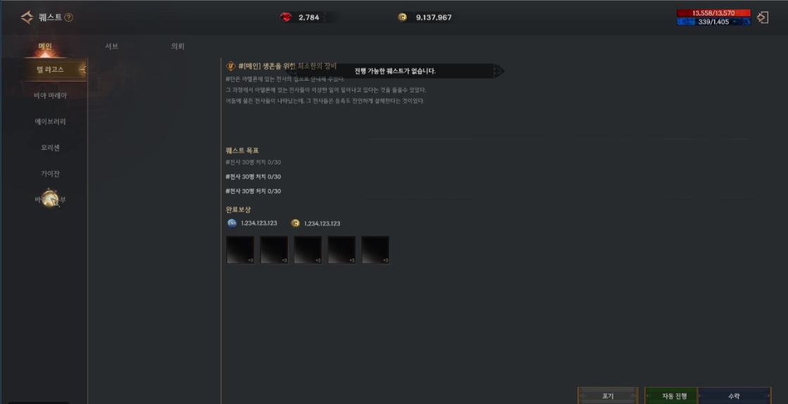 진작 메인퀘 다밀고 의뢰,메인퀘,서브퀘 다사라져서 메인퀘 다밀어서 안나오는갑다 하고있었는데 왠