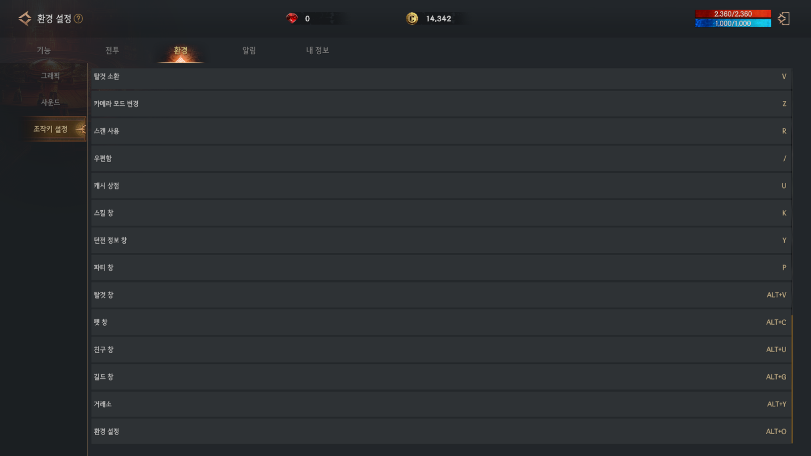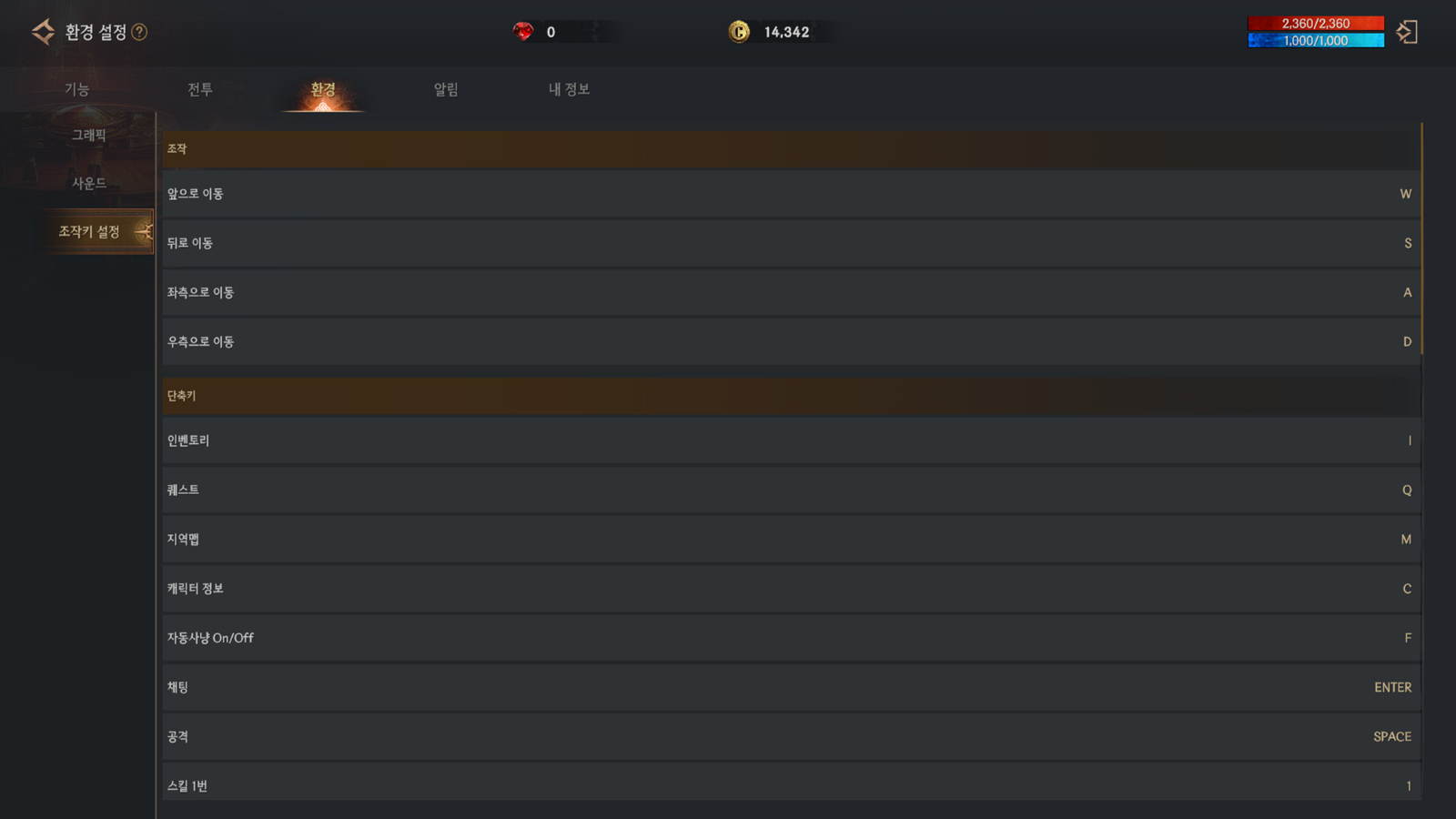 게임 플레이에 필요한 조작키를 설정할 수 있습니다.