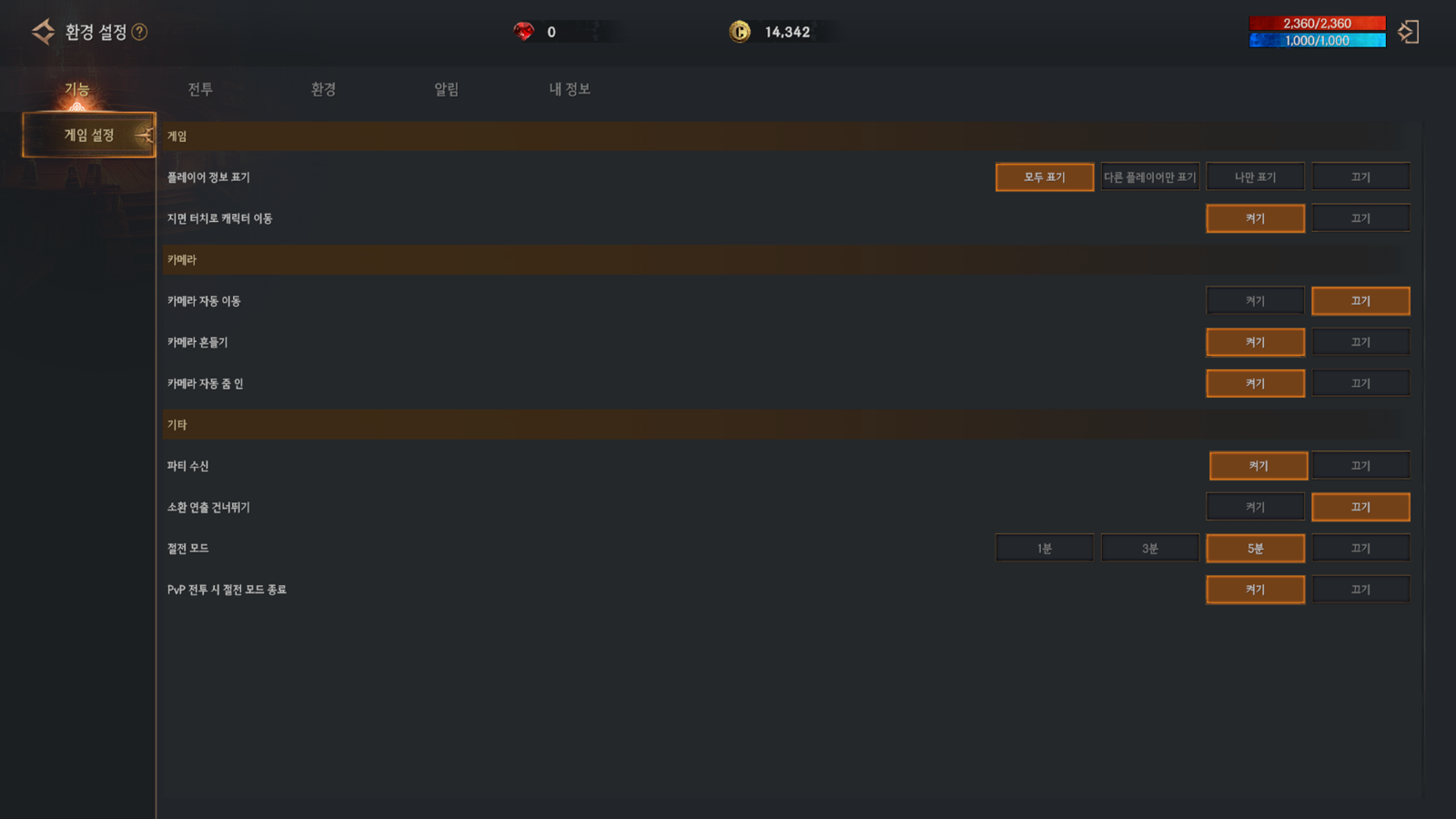 게임 설정에 필요한 기본 기능들을 설정할 수 있습니다.