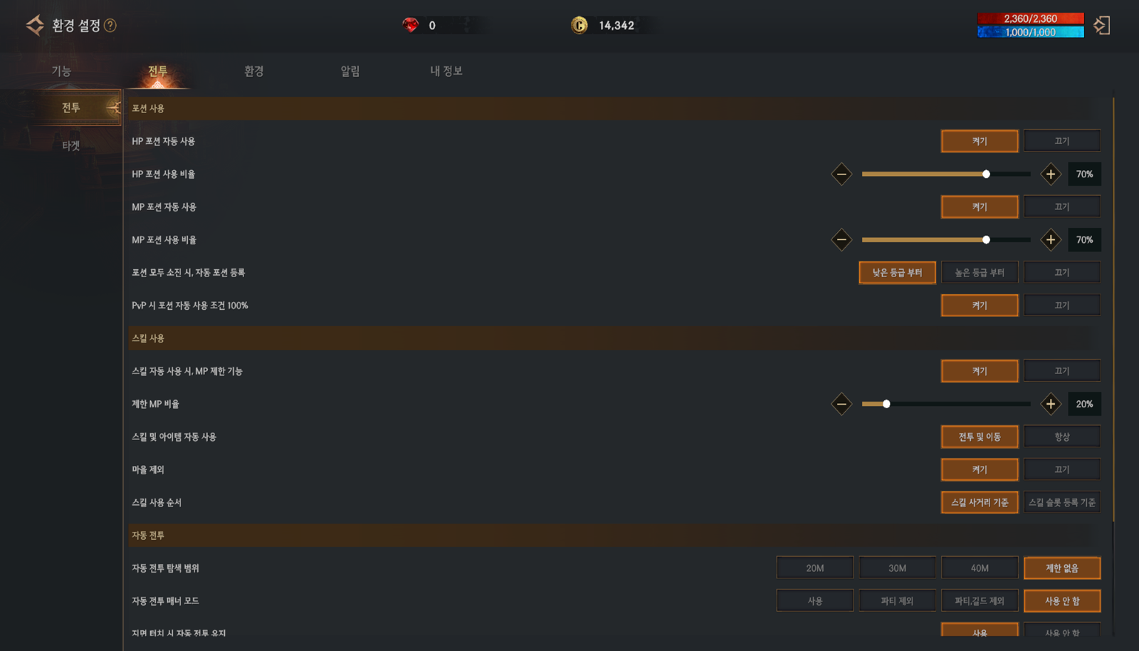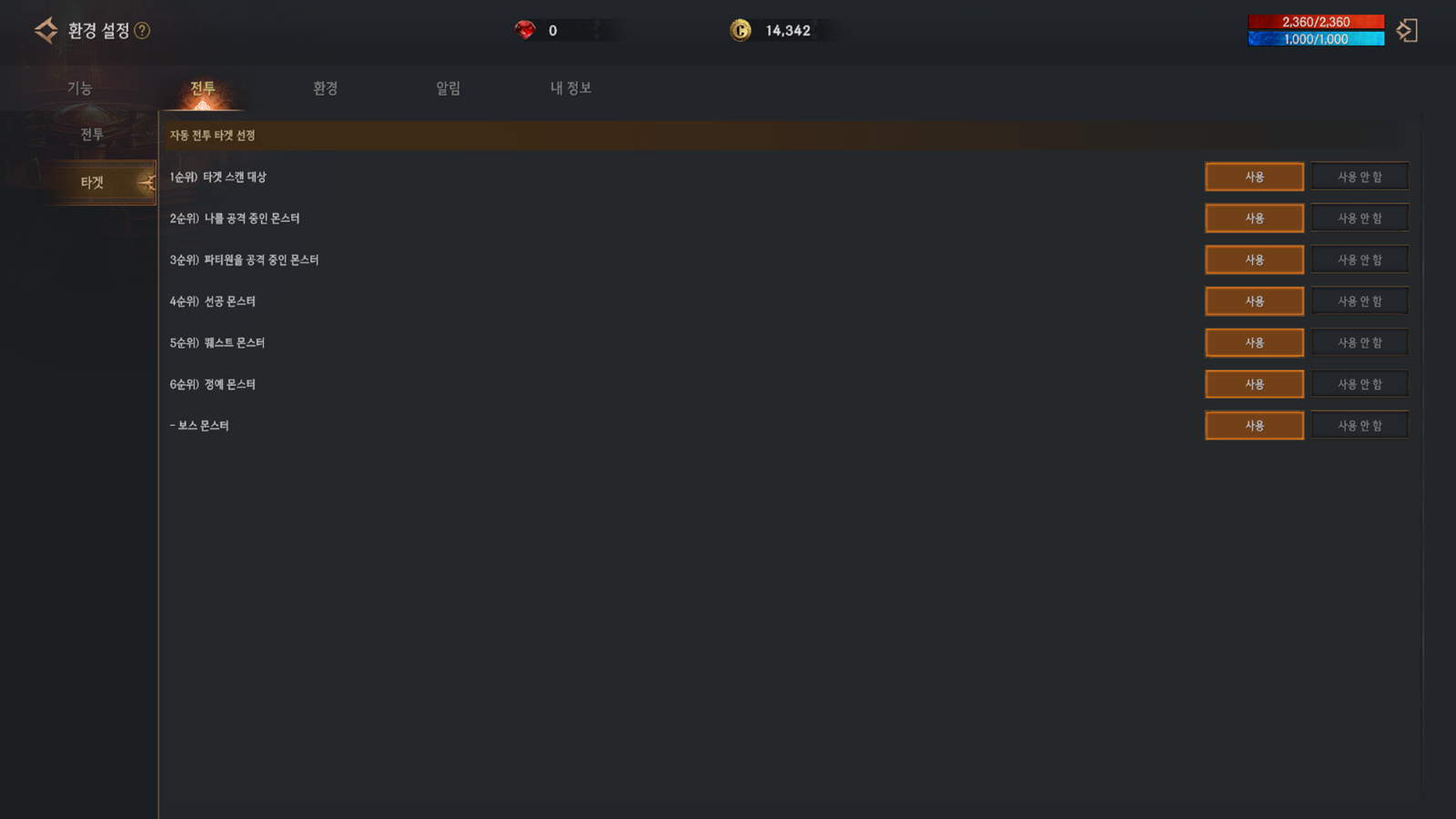 자동 전투 시 타겟 선정을 설정할 수 있습니다.