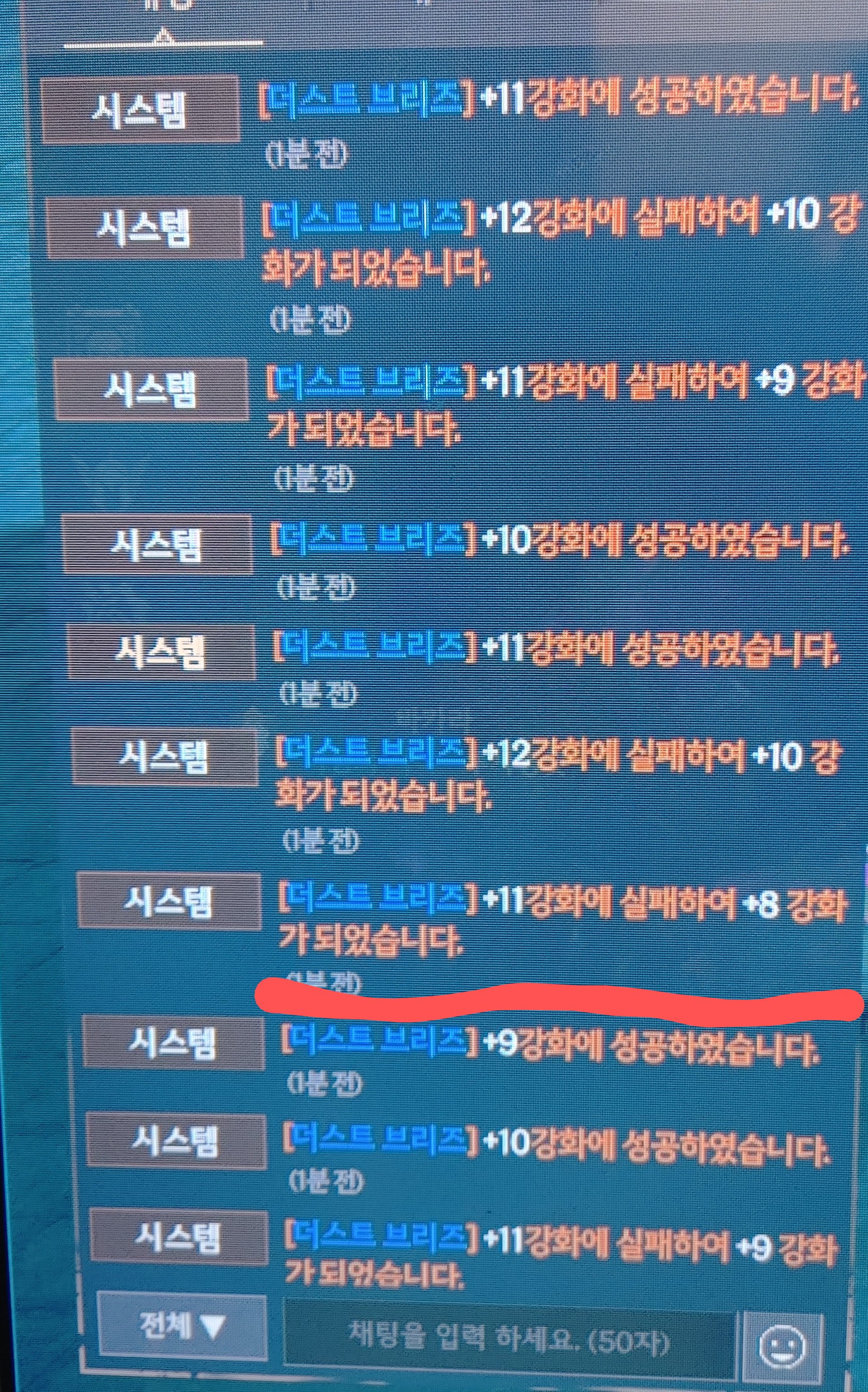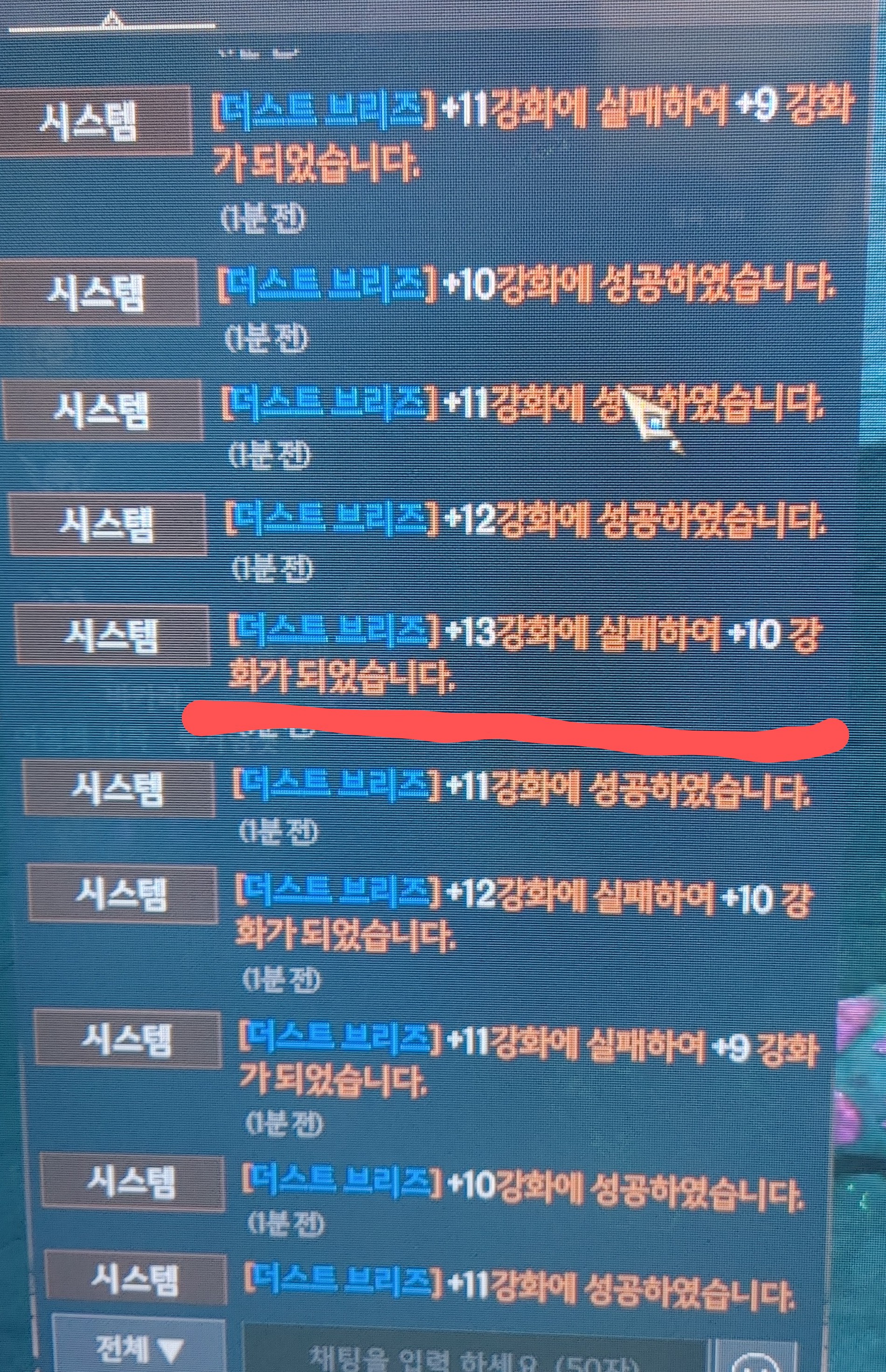 10강 이하에서 강화성공보다 실패가 더 많은반면, 15강 갈때는 45프로 성공률에서 많으면 10번이상 미끄러집니다. 한 두개 강화 해보고 말하는게 아니라 전체파츠 다 강화해보고 말하는거에요.