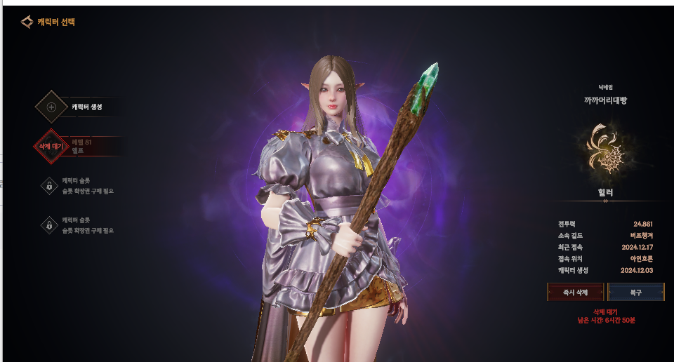 본캐가 삭제됏습니다 해결해줘요