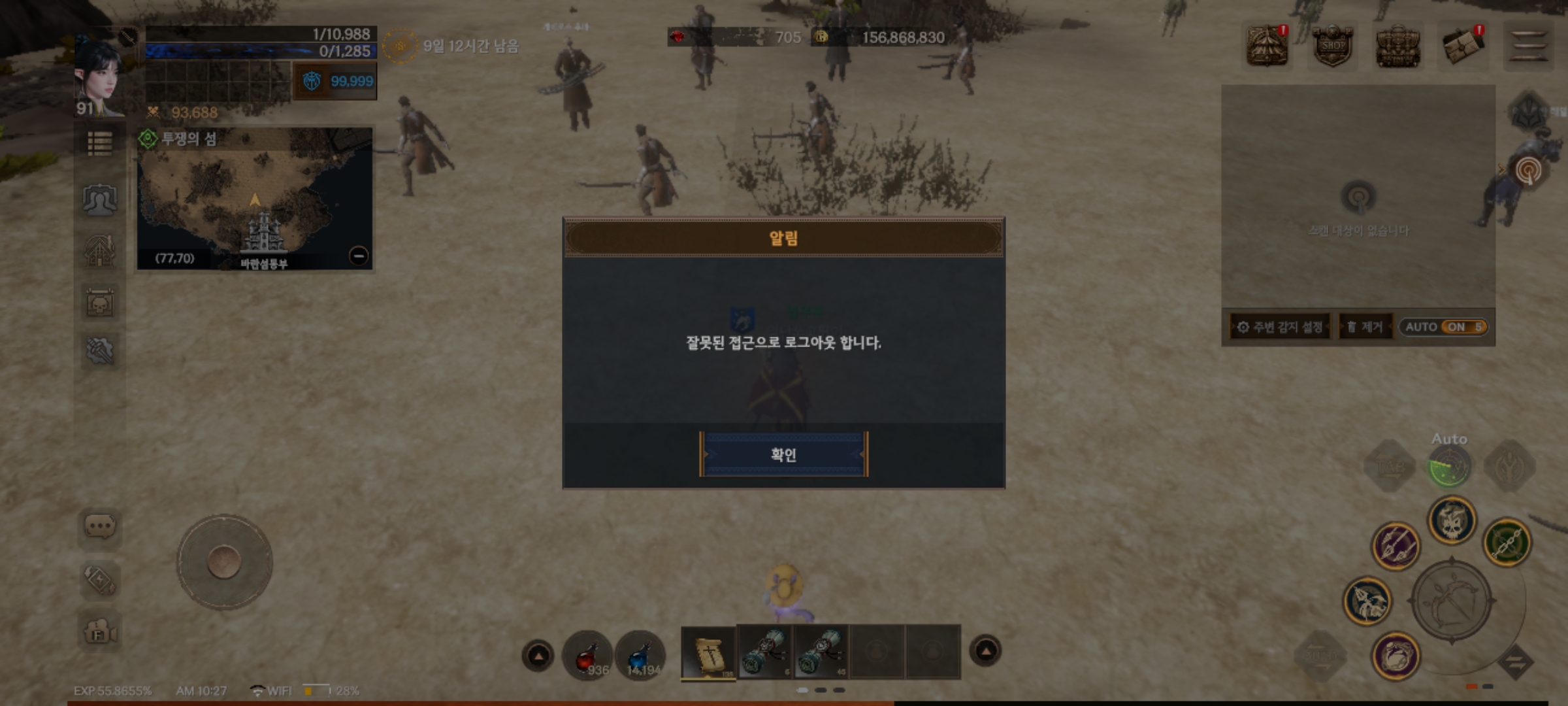 그래서 테스트 하려고 다른캐릭으로 접속해서 투쟁의 섬으로 가면 똑같이 팅깁니다.