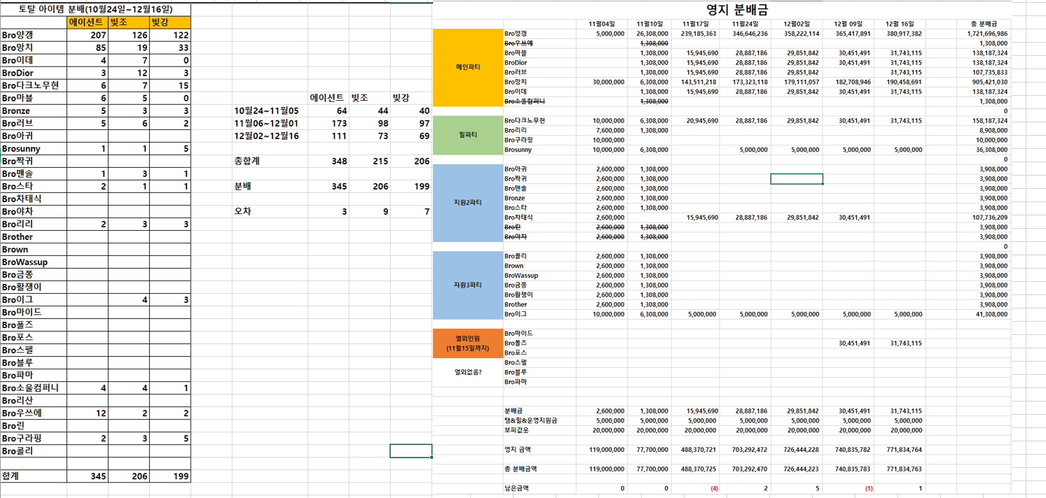 아래 내용은 제가 총무 역할하면서 만든 자료와 이 글도 다른 사람이 작성했다고 헛소리할꺼 뻔해서 제 케릭터 인증과 엑셀 내용 첨부해드립니다. 참고로 이 자료는 제가 엑셀로 직접 작성하고 수정하였기에 다른 운영진들은 스샷 내용으로만 봐서 저만 작성 및 수정할 수 있습니다.