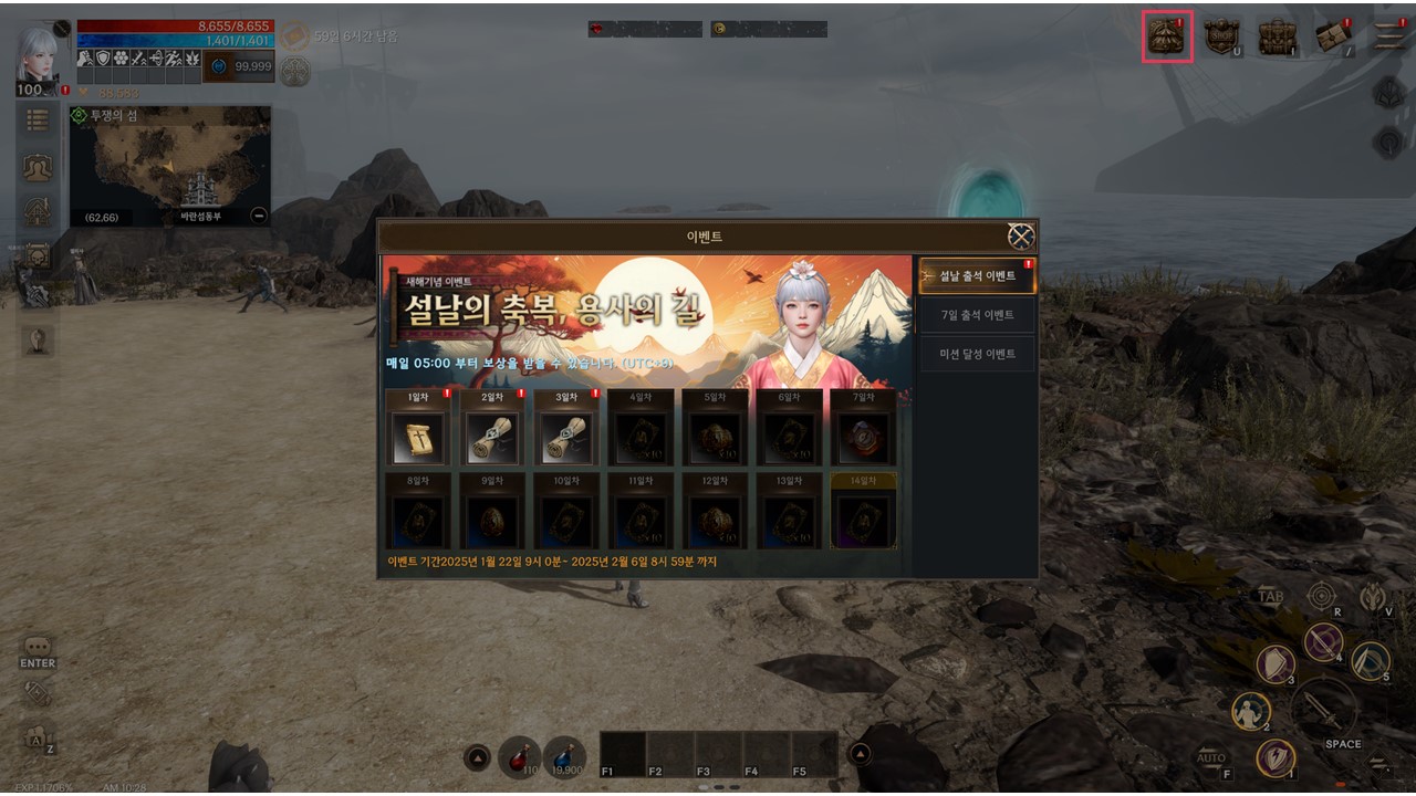 - 우측 상단의 이벤트 아이콘을 클릭/터치하여 출석 이벤트 화면에 입장할 수 있습니다.