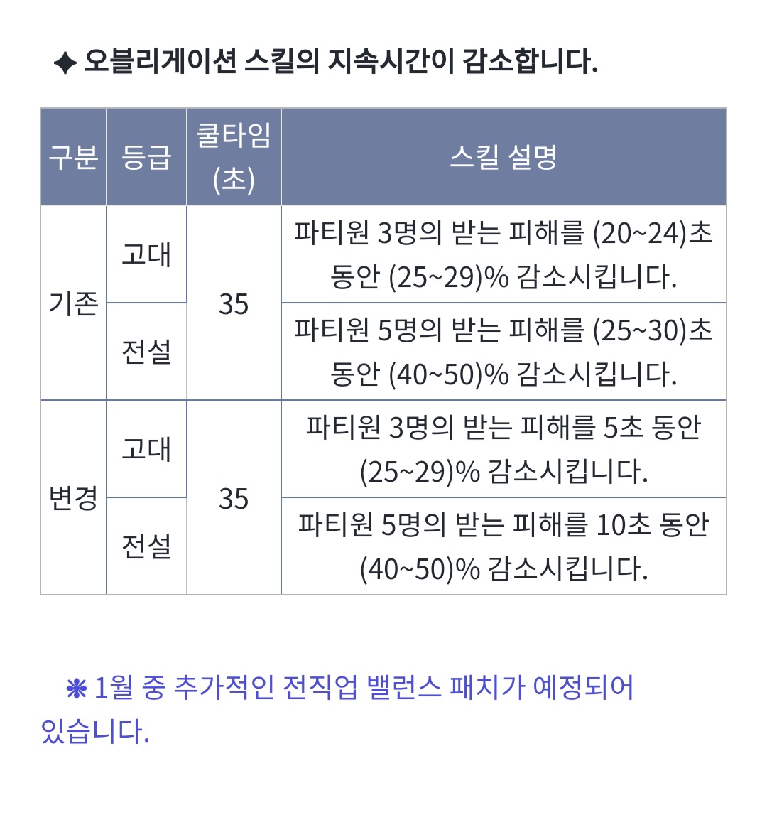 오버밸런스로12월18일패치되었던 오블리게이션 지속시간이 다시원상복구되었습니다