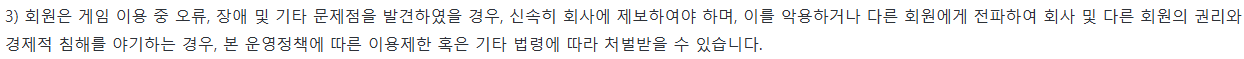전날부터 뮨 중첩버그로 게시판이 뜨겁게 달궈진점, 이미 자신들도 모든 데미지가 1이 들어오는것도 알고있었는데 악용한점, 버그인점을 인지하였음에도 편법으로 사용해 분쟁중인 게임에서 자신들의 이득으로 악용한점, 가이잔 지역의 영지보스를 격투가 기사들은 윤튼튼 노무현 (조)빱 카모플라쥬 이 6캐릭으로 방어무시 전설 드릴샷 2개 포함 상대 한길드의 집중화력을 모든 데미지 1로 받아가며 차지함. 이것은 자신들도 버그인지 모를수가 없는 버그상태인점. 이미 전날부터 인지 하였음에도 이를 악용해 게임내에서 형평성에 어긋난 부당이득을 취득함. 게임 운영정책에 위배되는 행위와 유저기만 엄중한 처벌 기다리겠습니다.