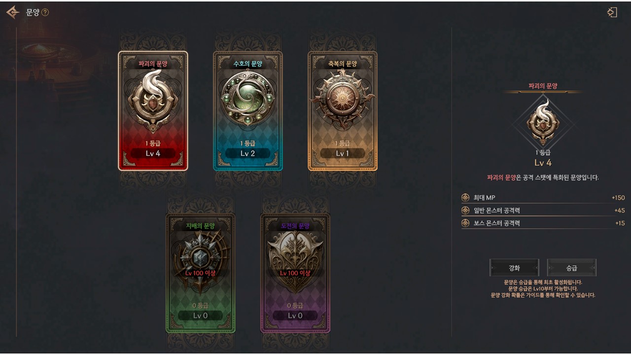 각각의 문양은 특정 레벨 달성 시 활성화되어 강화 / 승급을 통해 성장시킬 수 있습니다.