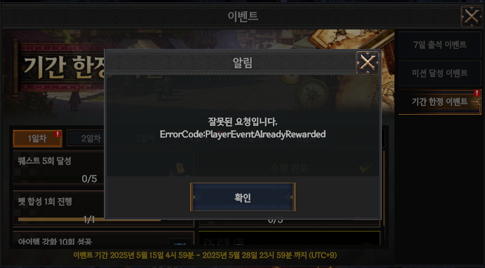 저렇게 오류 메시지 뜨면서 받기 안됩니다 게임 종료하고 다시 켜면 초기화 되버리네요