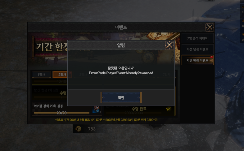 예상했지만 숫자가 카운팅되어 있지 않아서 다시 강화 시도함 > 잘못된 요청 오류