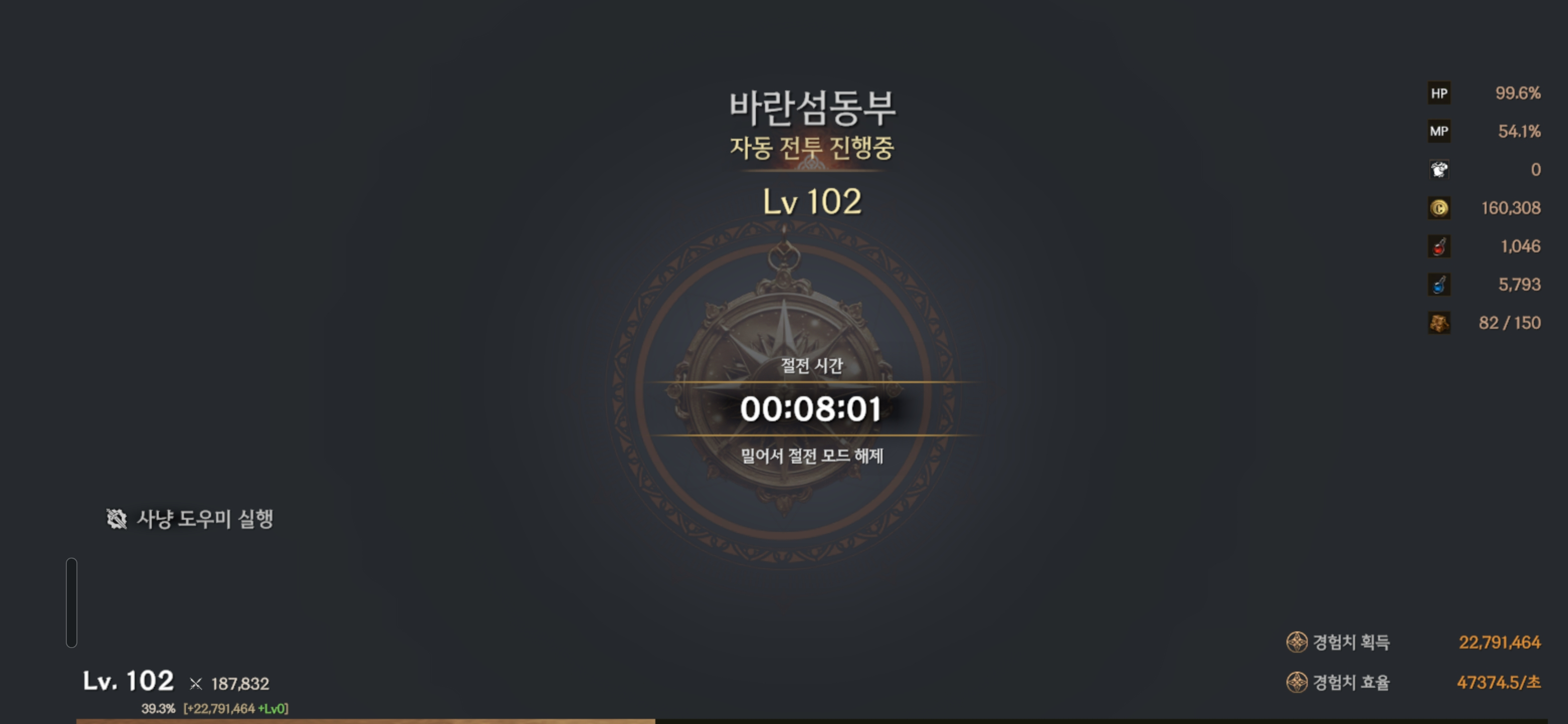 경험치 표기 부분이 개선되었으면 하는데요. 왼쪽 하단에는 (+획득 경험치 +Lv), 오른쪽 하단에는 획득 경험치, 경험치 효율이 표기되는데, 획득경험치가 좌우 중복으로 표기될 이유는 없어보입니다.