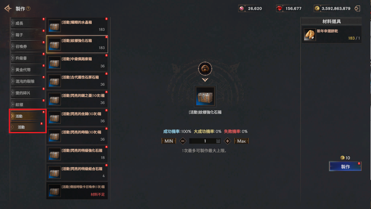 | 紋樣強化石 | 10 | 新年幸運餅乾 | 1 | 10克倫 | 100% |