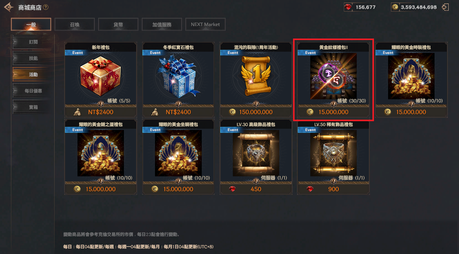 | 新年禮包 | 4500紅寶石箱 | 1 | 2,400 NTD | 帳號限購5次 |