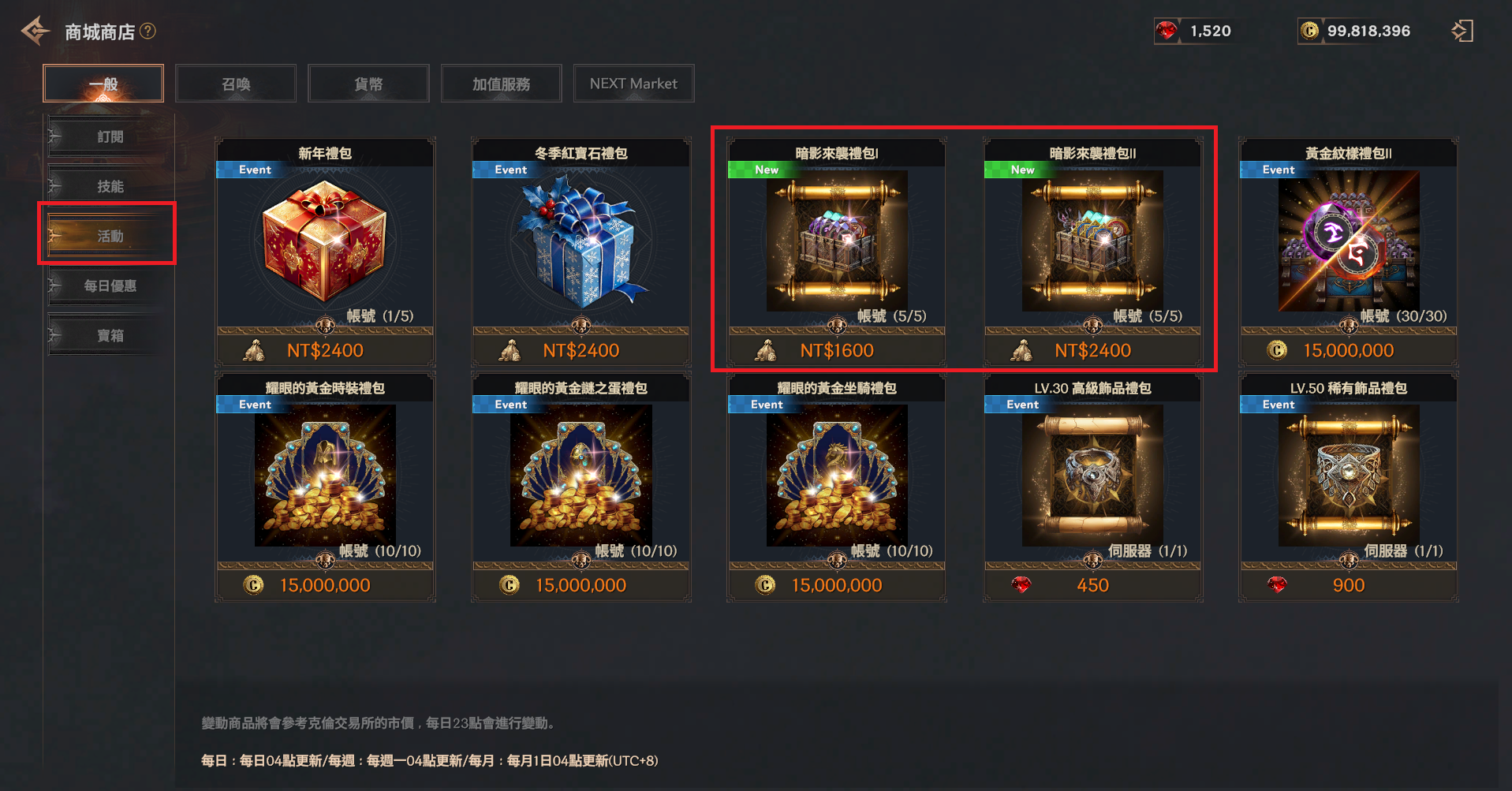 | 暗影來襲禮包Ⅰ | 遠古技能強化石 | 50 | NT$1600 | 帳號限購5次 |