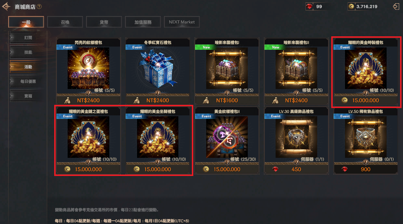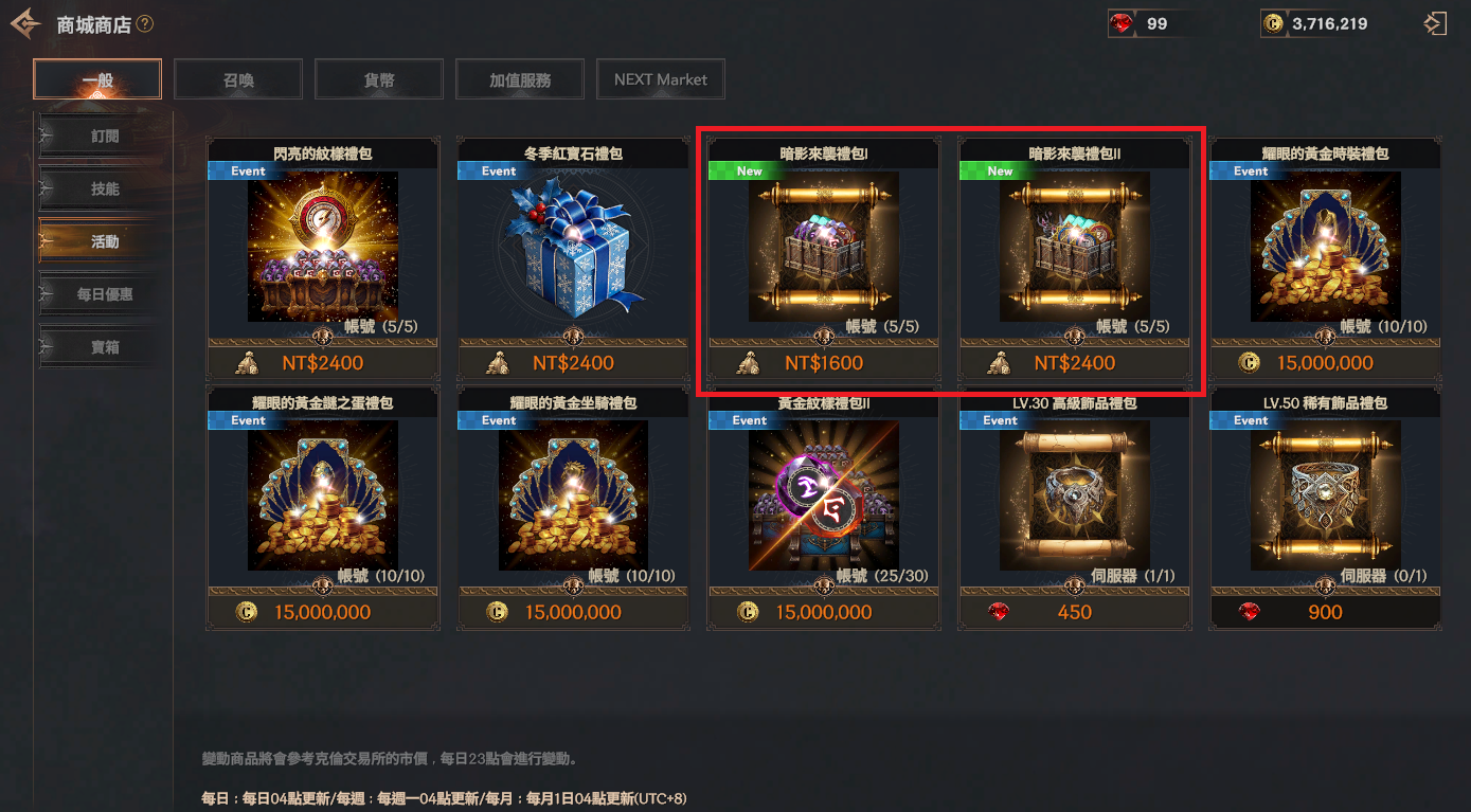 | 暗影來襲禮包Ⅰ | 遠古技能強化石 | 50 | NT$1600 | 帳號限購5次 |