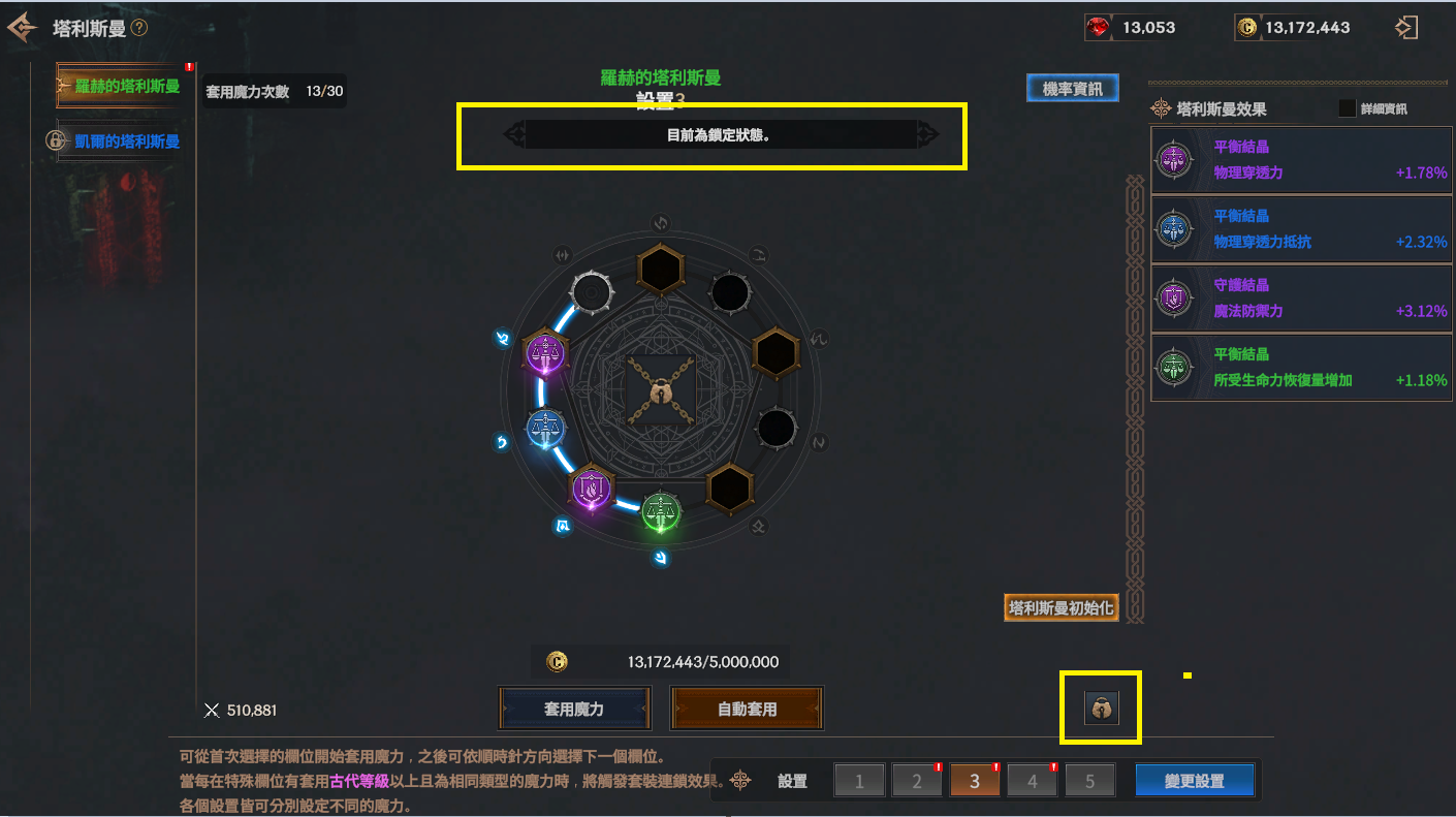 ✧ 已鎖定的塔利斯曼將於中央顯示鎖定標記,且無法進行套用魔力與初始化。