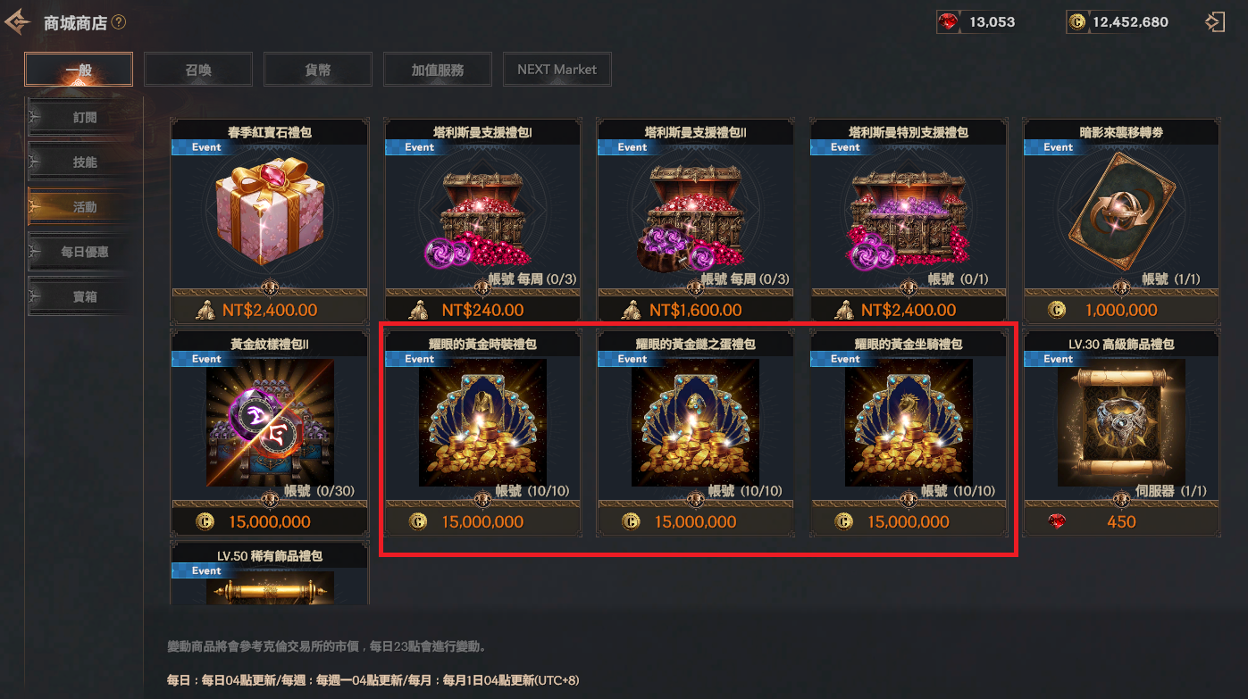 | 耀眼的黃金謎之蛋禮包 | 耀眼的謎之蛋(10次) | 1 | 1500萬克倫 | 帳號限購10次 |