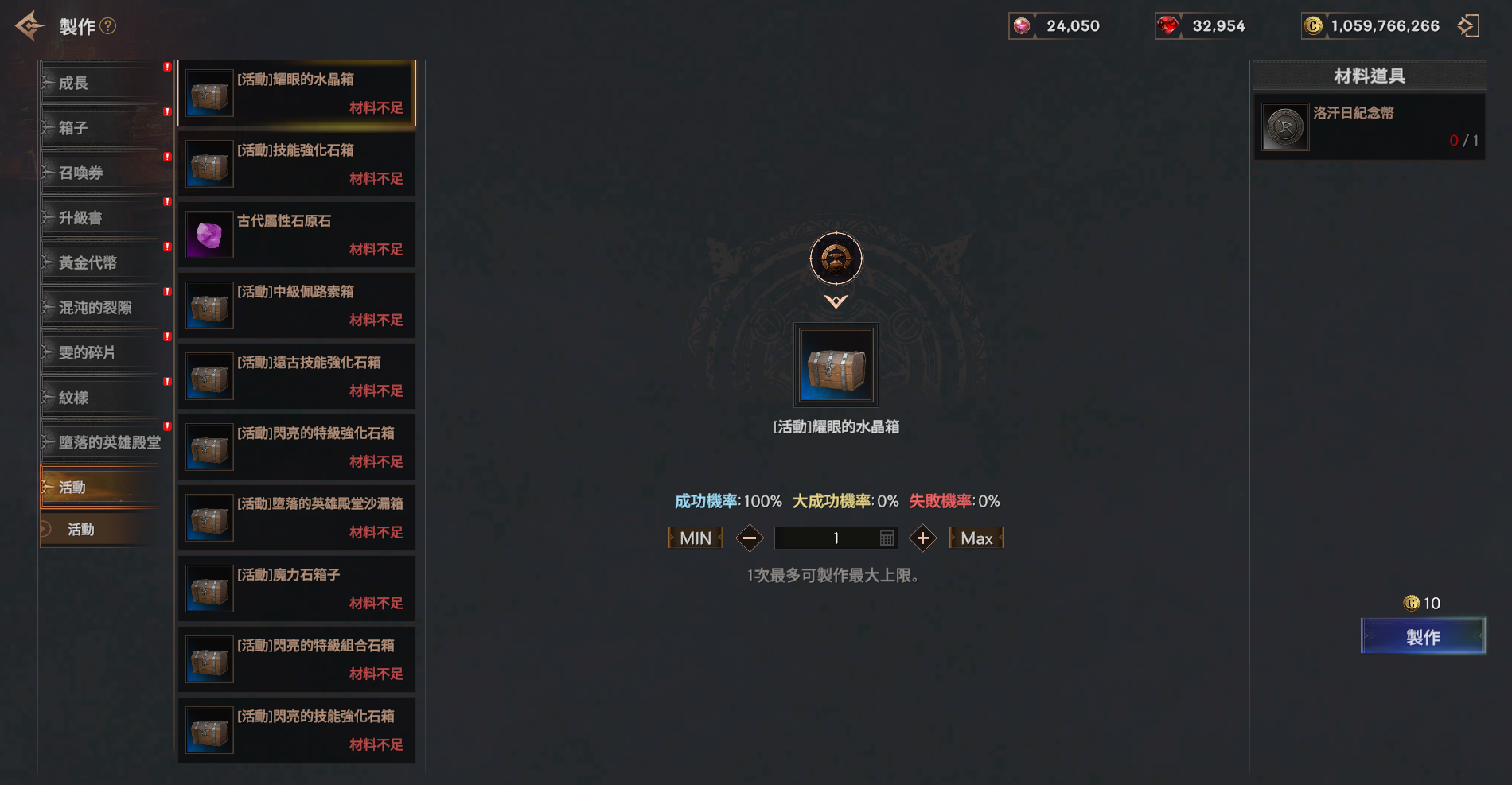 | 遠古技能強化石 | 1 | 洛汗日紀念幣 | 8 | 10 克倫 | 100% |