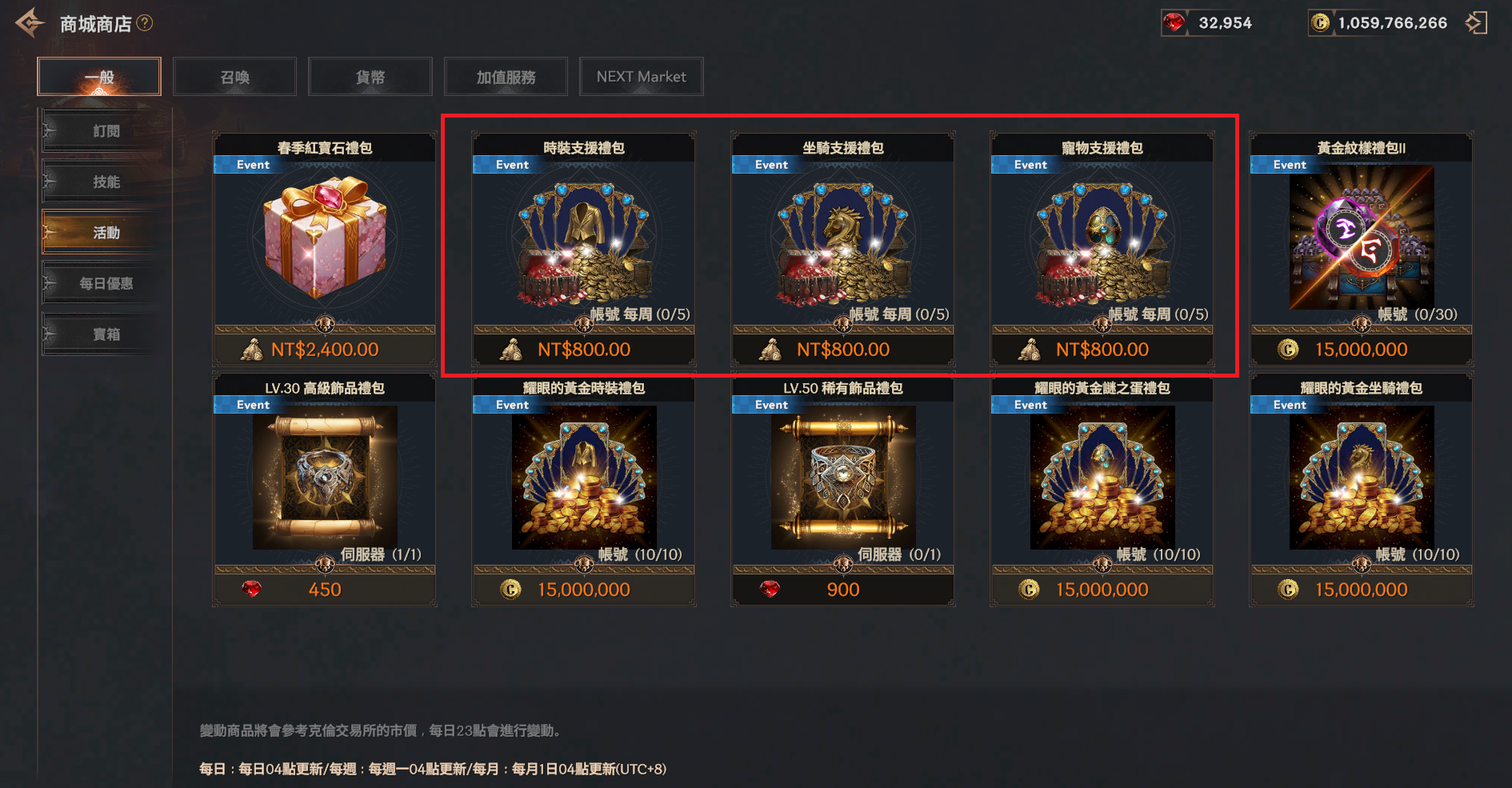 | 坐騎支援禮包 | 1000 紅寶石箱 | 1 | NT$800 | 每週限購5次 |