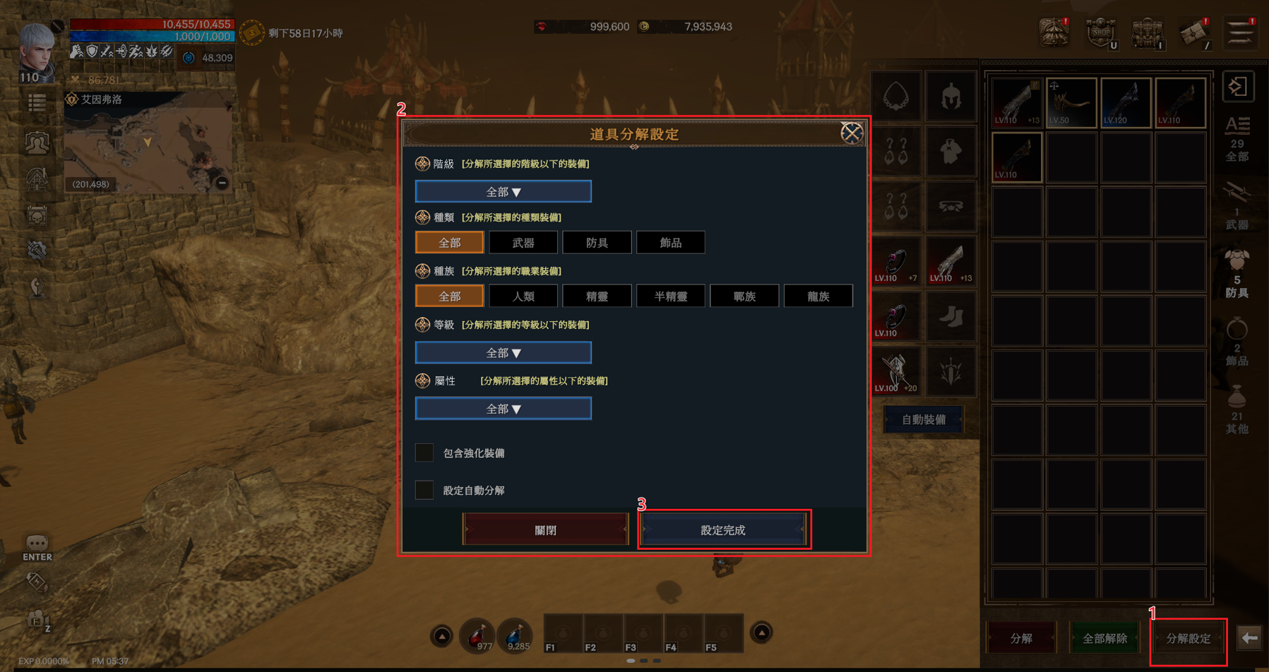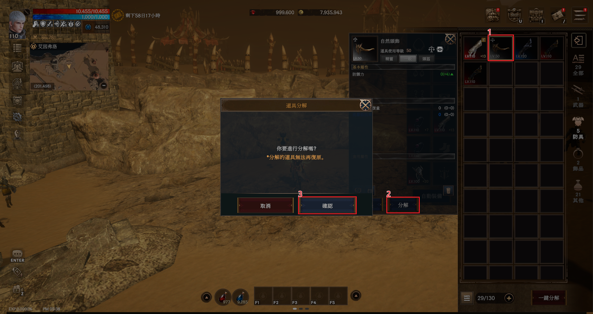 ③ 確認是否要進行道具裝備分解。