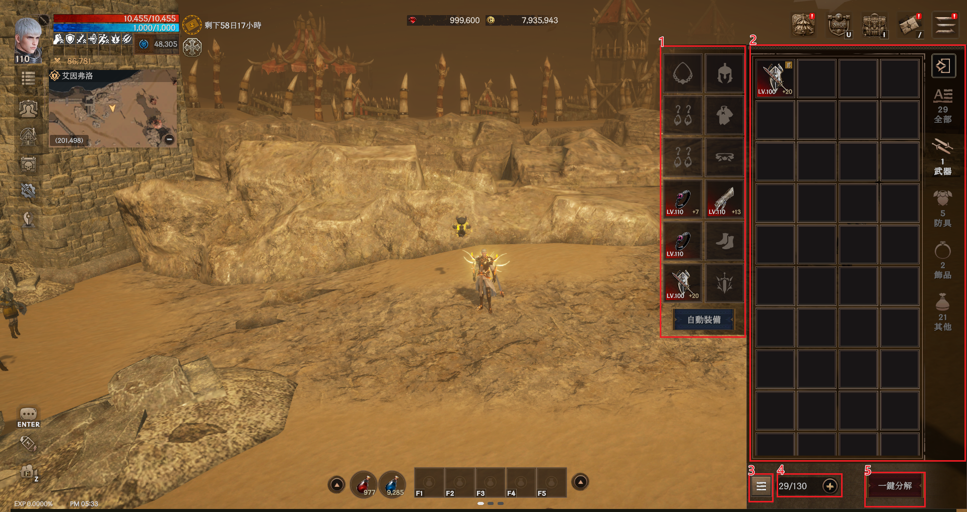 ⑤ 可以一鍵分解道具裝備。