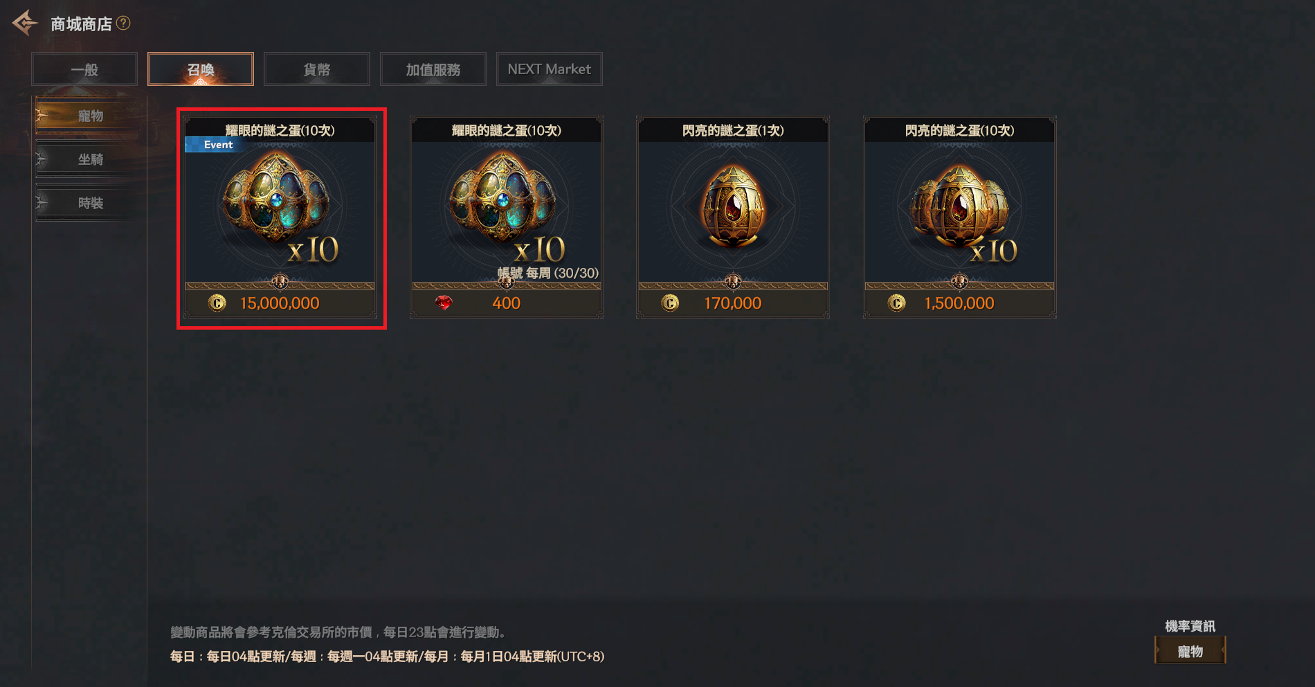 | 耀眼的坐騎召喚券 (10次) | 1 | 1500萬克倫 | 無限制 |