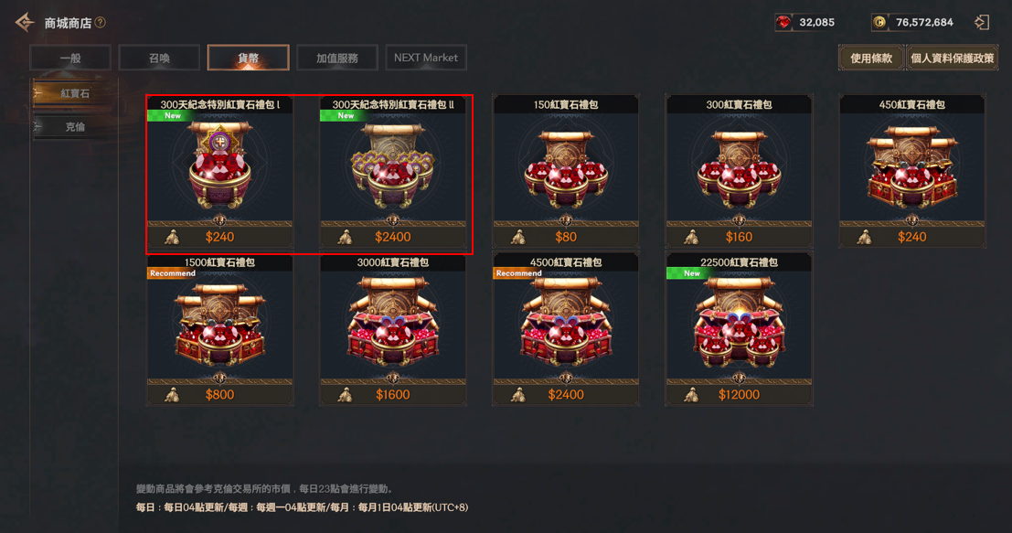 | 300天紀念特別紅寶石禮包I | 450 紅寶石箱 | 1 | TWD 240 | 無限制 |