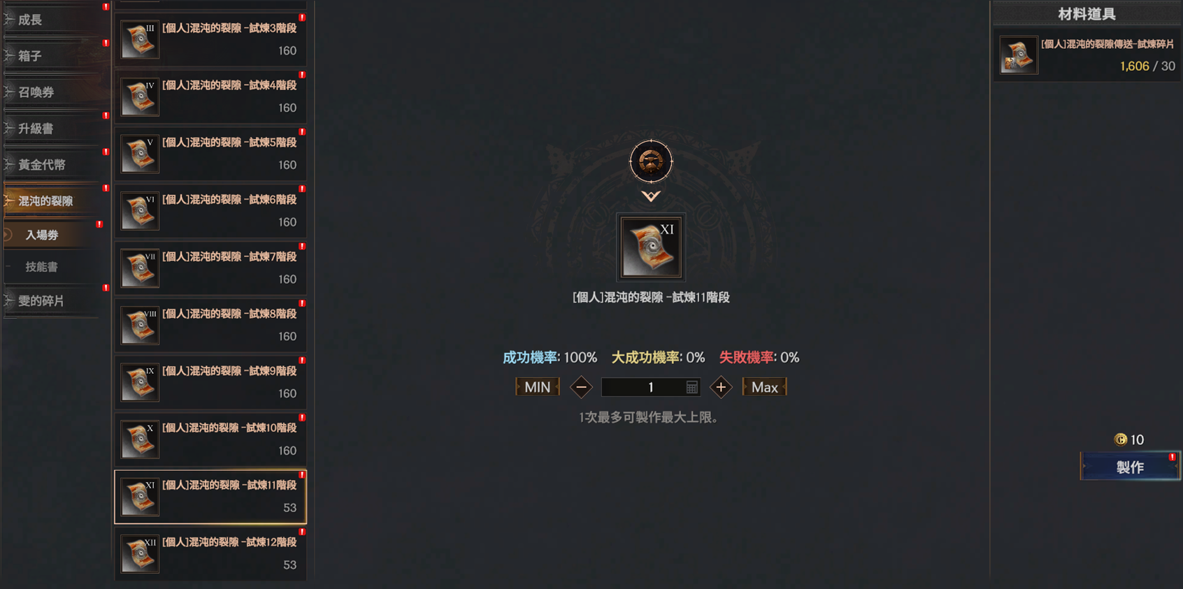 | [個人] 混沌的裂隙 - 試煉11階段 | [個人] 混沌的裂隙傳送 - 試煉碎片 | 30 | 10 克倫 | 100% |