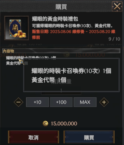 | 耀眼的黃金時裝禮包 | 耀眼的時裝卡召喚劵(10次) | 1 | 1500萬克倫 | 帳號限購10次 |