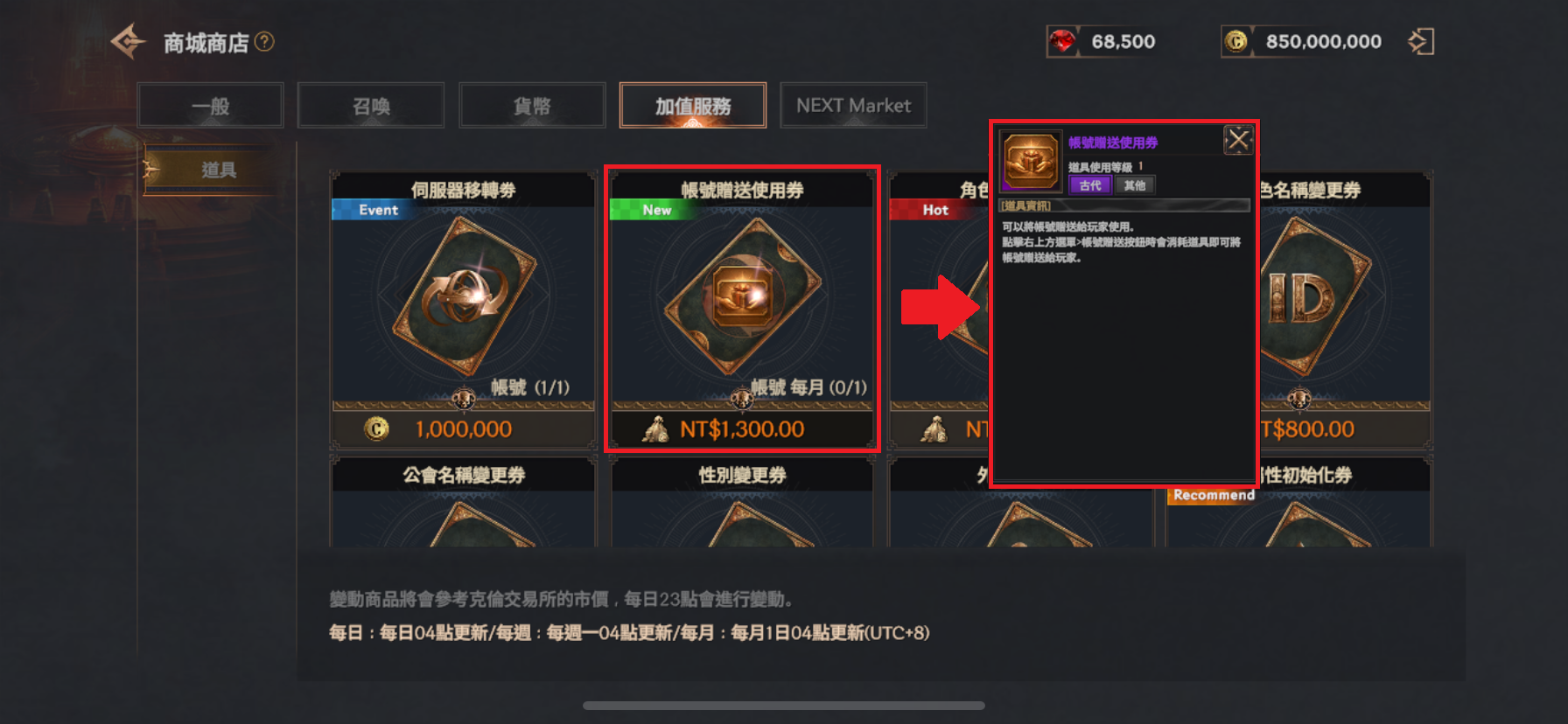 帳號贈禮使用券可於 【商城】-【加值服務】 中購買,且購買次數限制為每月 1 次。