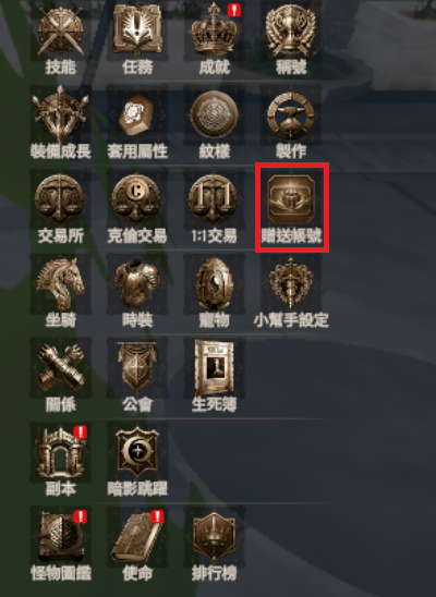 - 持有帳號贈禮使用券的角色,可進入 【贈送帳號】 選單,進行贈送流程。