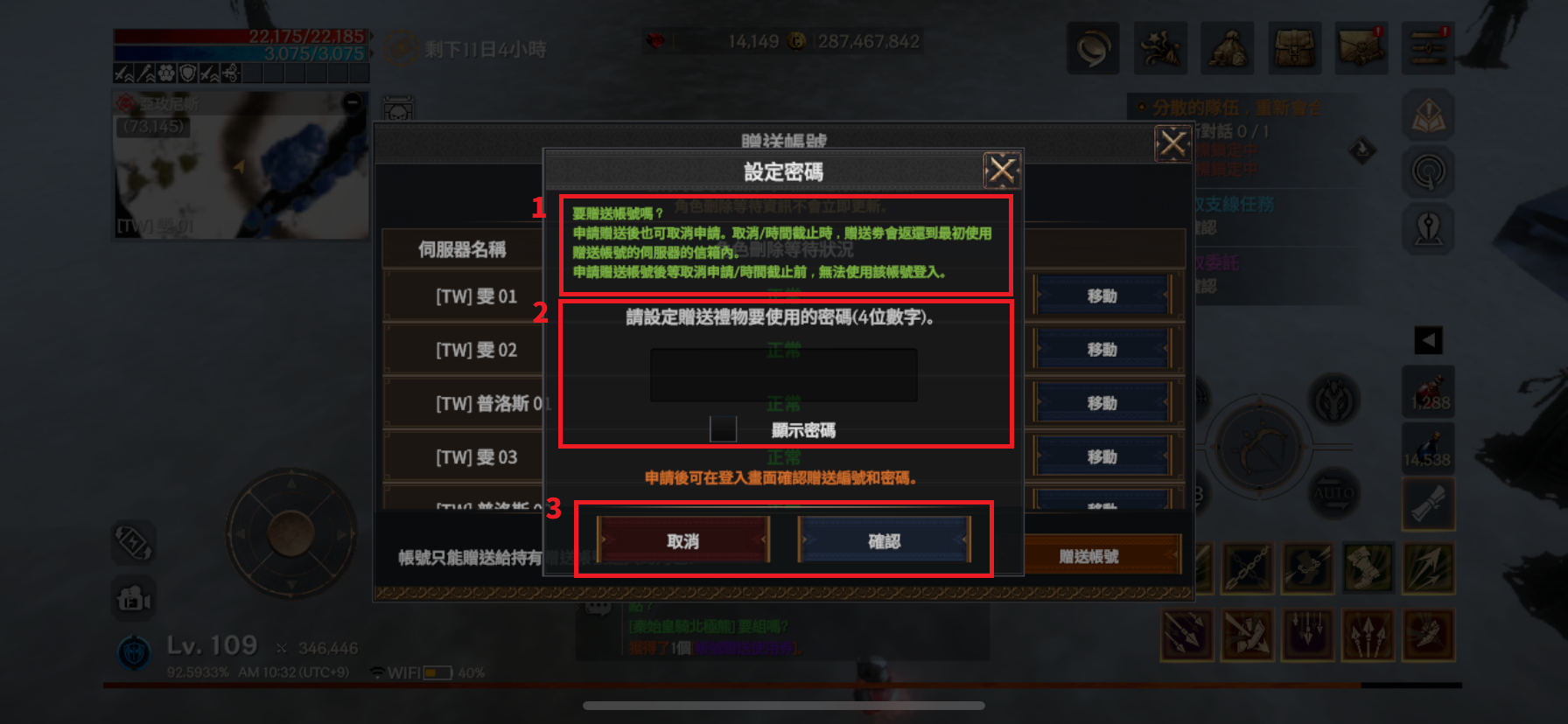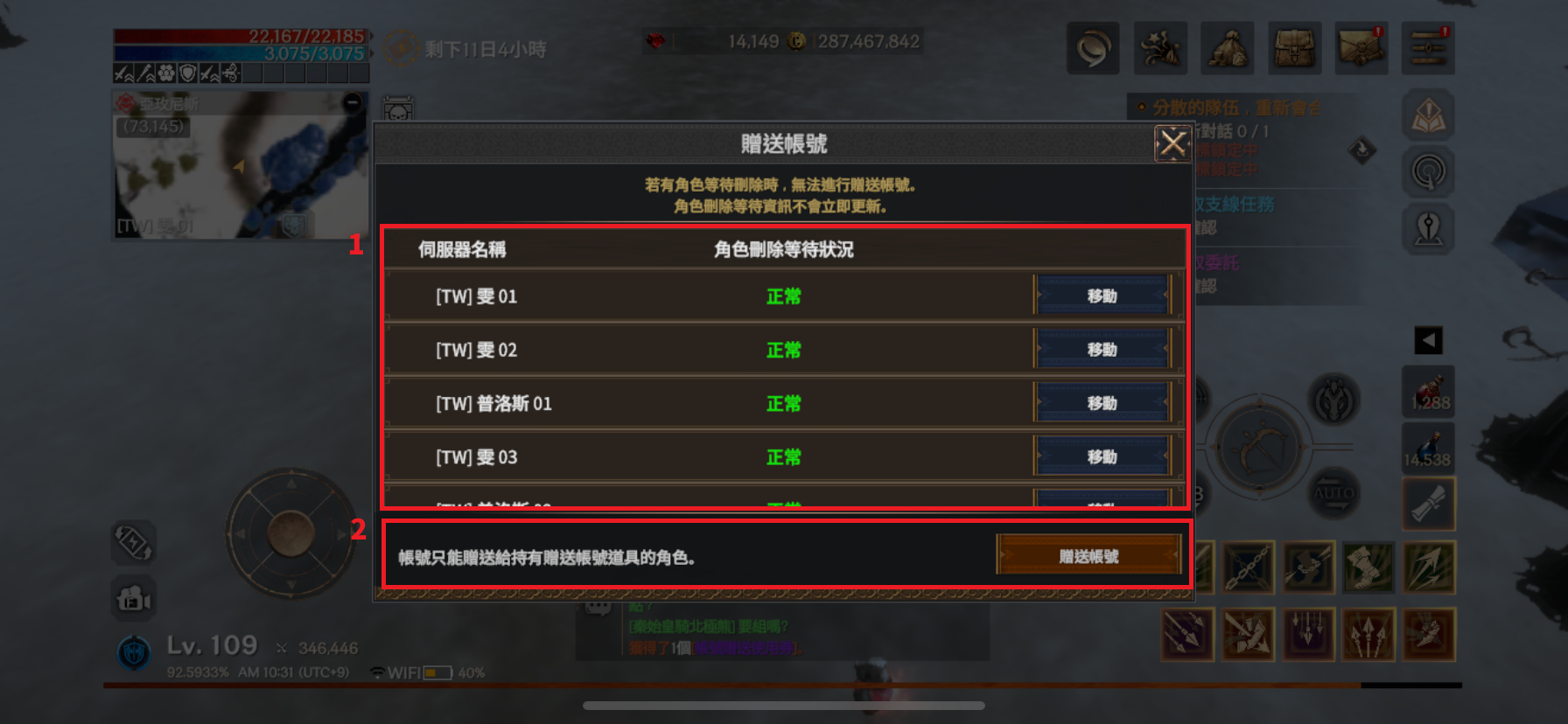 ① 要贈送帳號,必須確保全伺服器內沒有處於刪除待機中的角色。