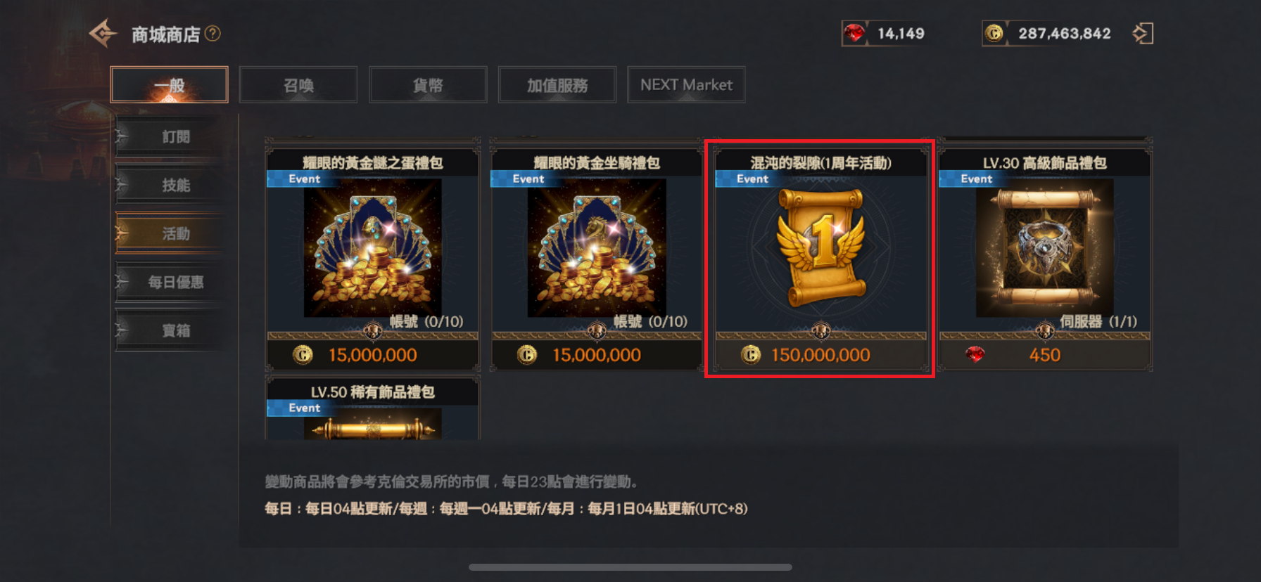 ▹ 活動期間內,可於商城以每張 1億5千萬克倫購買活動專用的混沌裂隙卷軸。