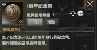 - 一週年紀念硬幣: 活動專用貨幣,可使用此硬幣製作耀眼的召喚券。