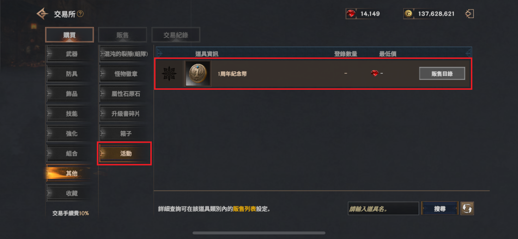 一週年紀念硬幣的交易所狀態可於 【交易所】 - 【其他】 - 【活動】 分頁中確認。