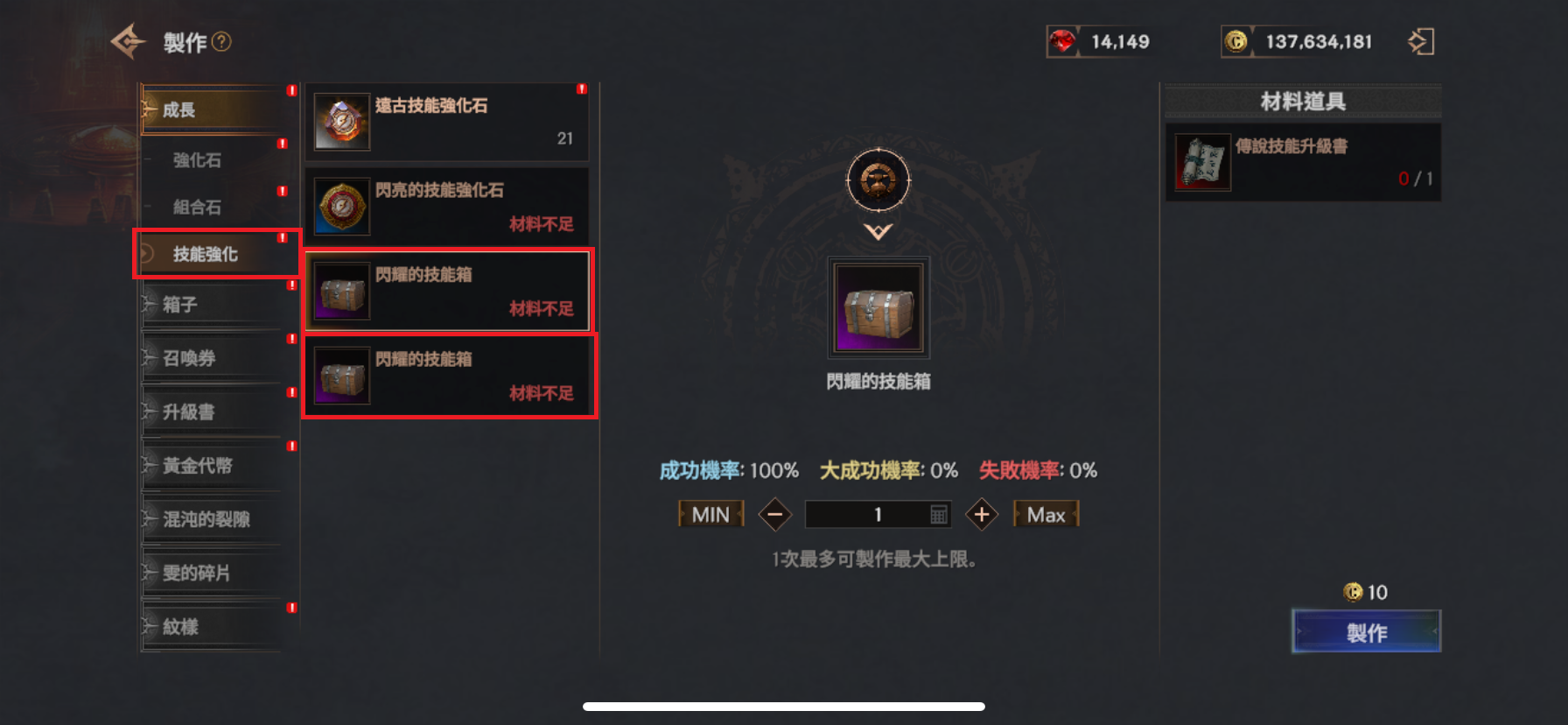 ✦ 可使用傳說/神話技能升級書作為材料,製作閃亮的技能強化石。