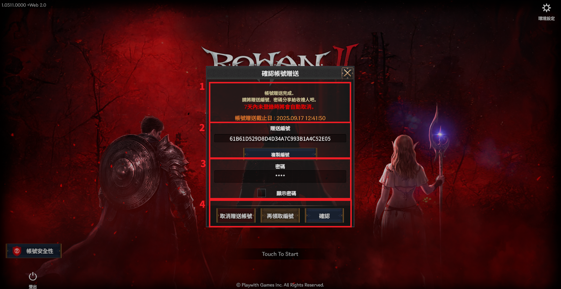> 已申請贈送的帳號,在取消申請或申請期限到期前,將無法登入及進行遊戲。