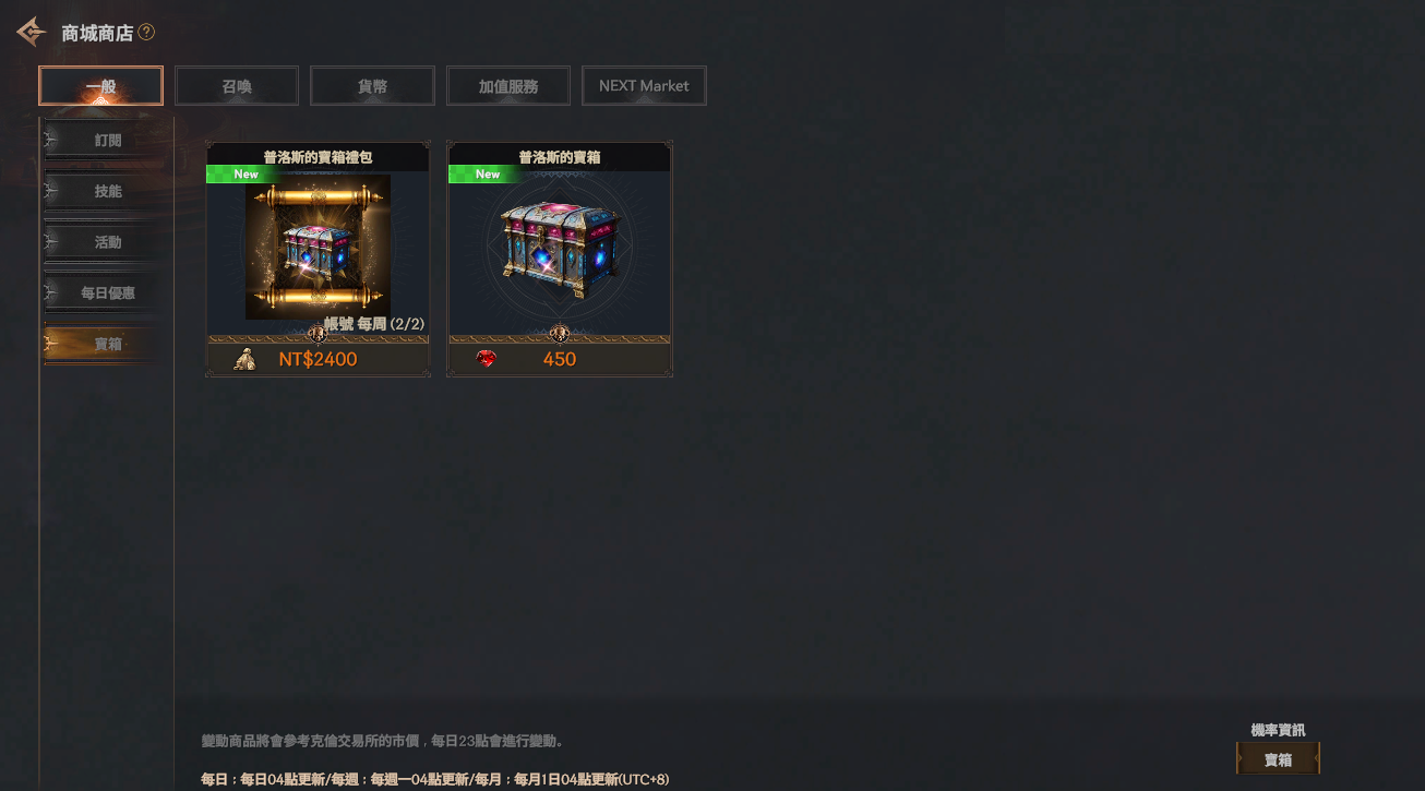 | 普洛斯的寶箱禮包 | 普洛斯的寶箱 | 25 | NTD 2,400 | 帳號每周限購2次 |