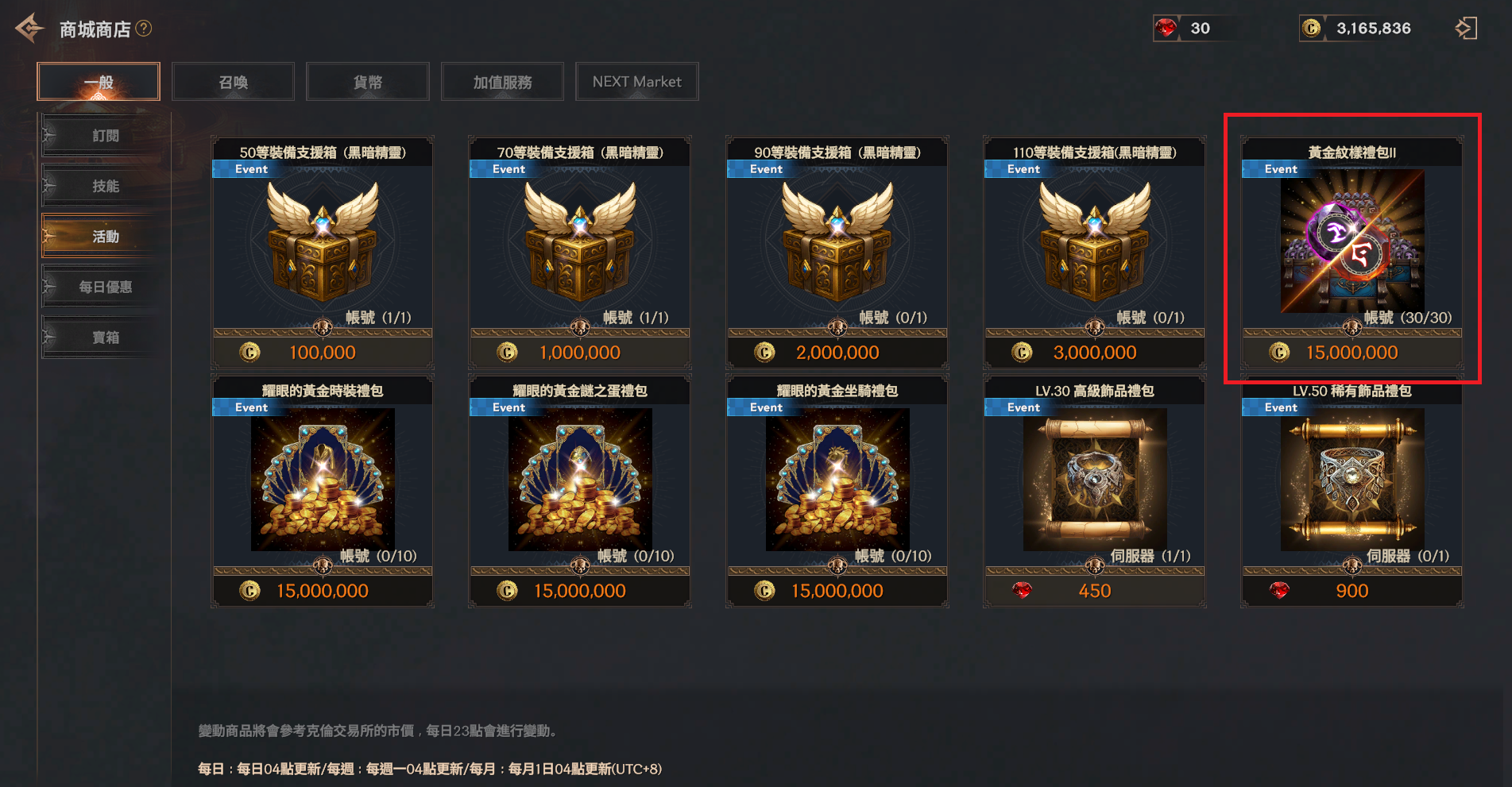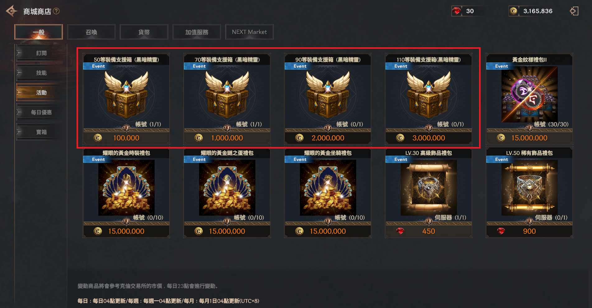 LV.110裝備支援箱 (黑暗精靈) | 3,000,000克倫 | 高級巫師帽 | 1 | 90級以上 帳號限購1次 |