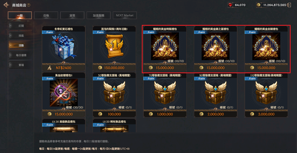 | 耀眼的黃金謎之蛋禮包 | 耀眼的謎之蛋(10次) | 1 | 1500萬克倫 | 帳號限購10次 |