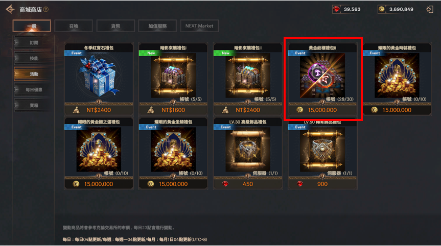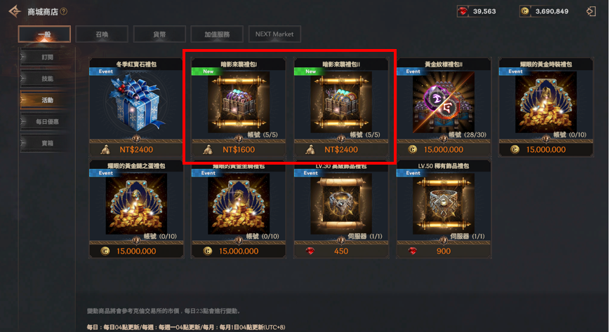 | 暗影來襲禮包Ⅰ | 遠古技能強化石 | 50 | NT$1600 | 帳號限購5次 |