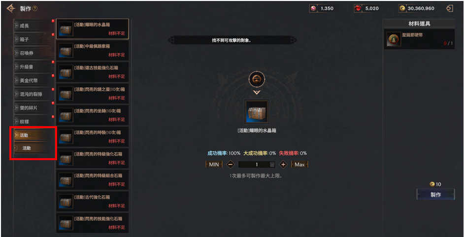 | 製作物品 | 製作材料 | 製作費用 | 成功機率 | ||