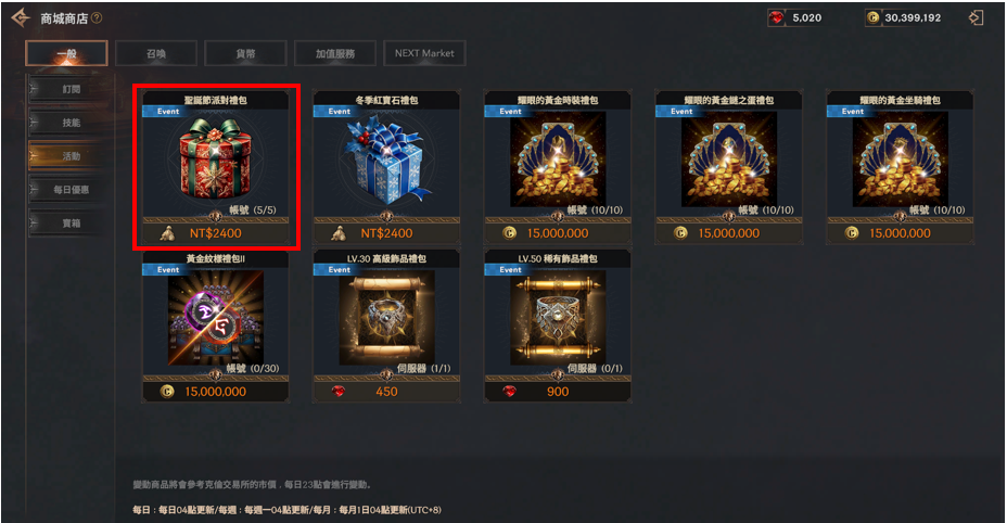 | 聖誕節派對禮包 | 上級佩路索箱 | 50 | 2,400 NTD | 帳號限購5次 |