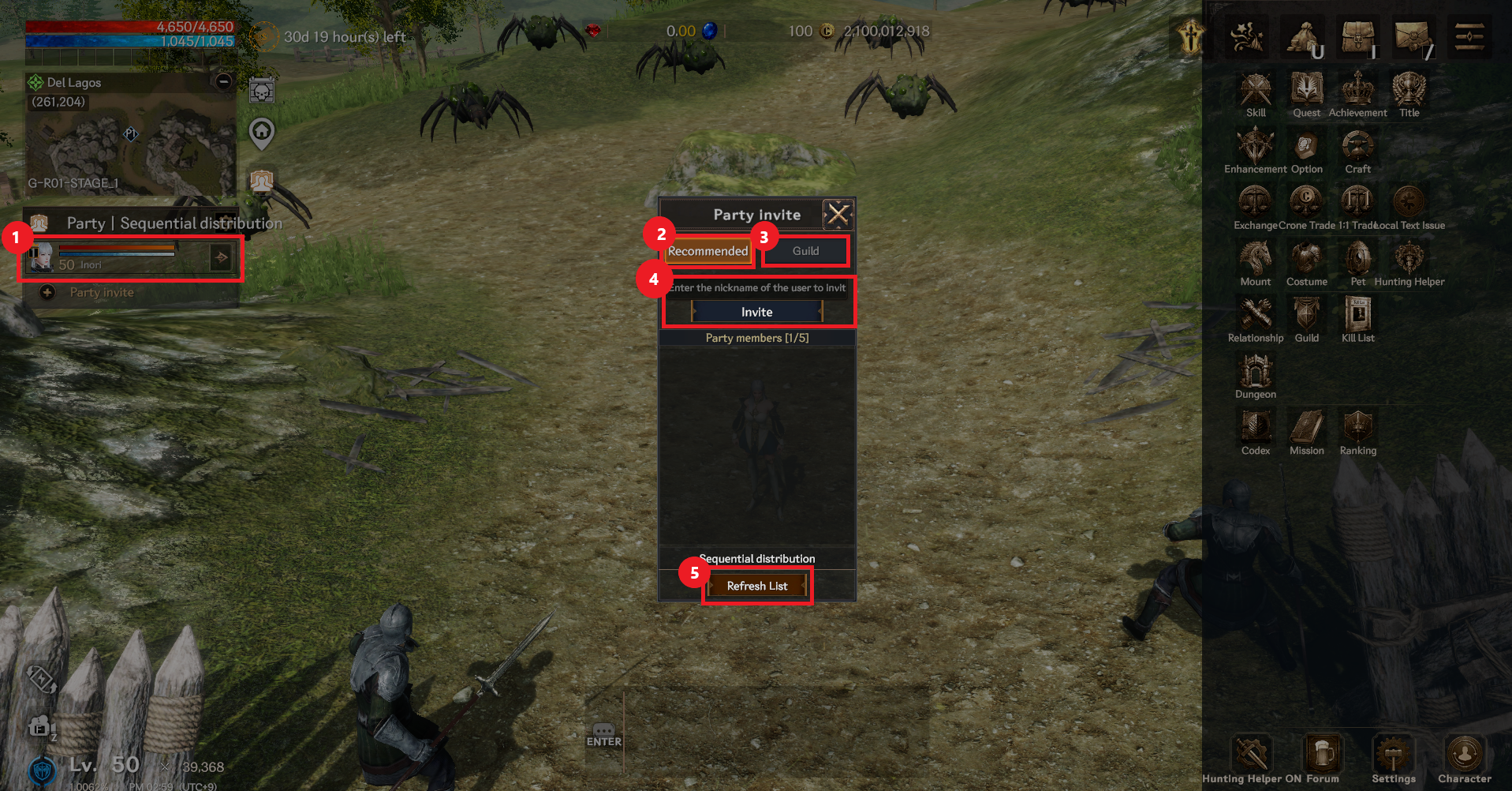 ④ You can invite directly by entering the character name of the adventurer you want to invite.