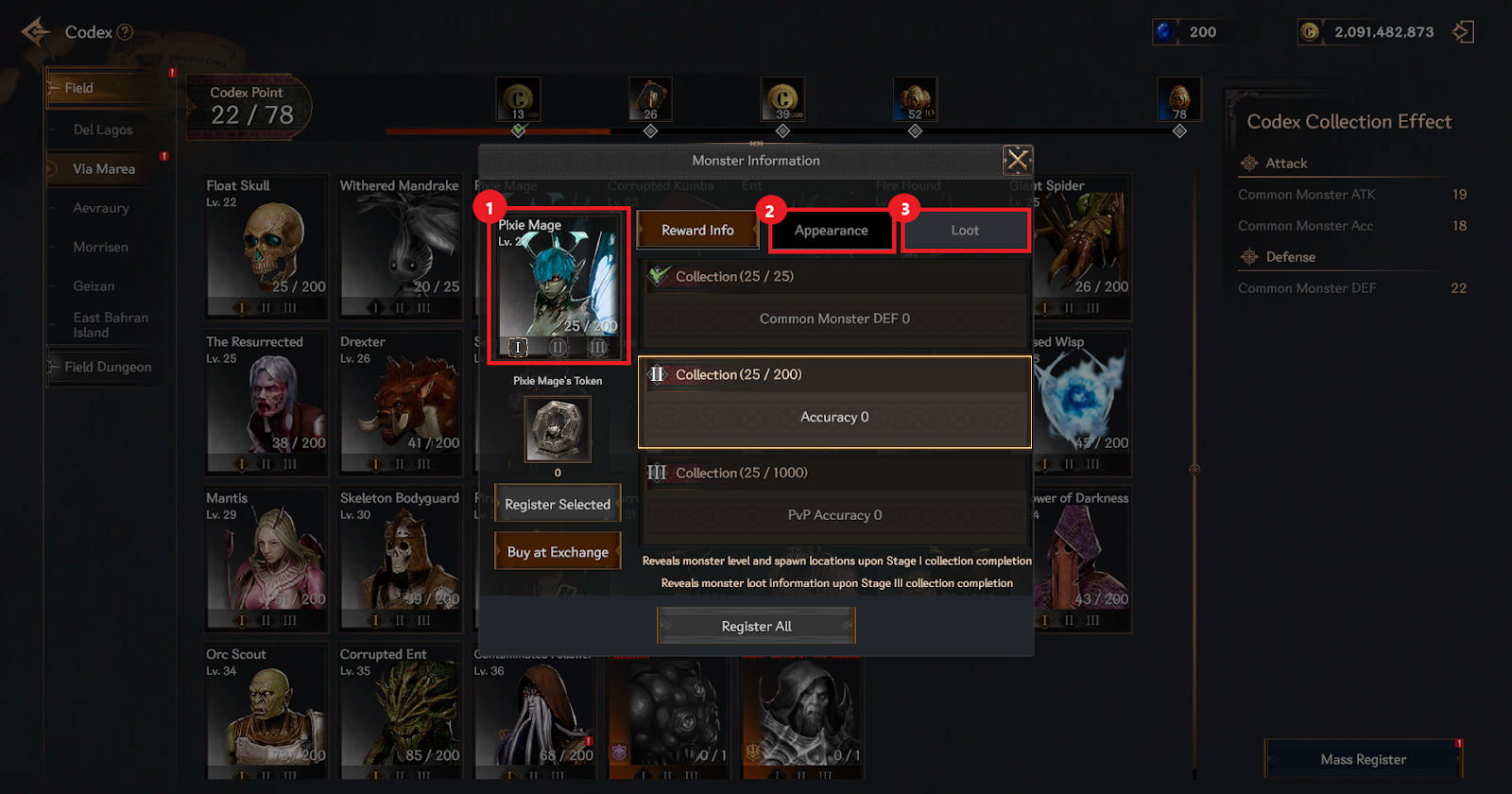 The codex allows you to view level information, spawn locations, and loot info for each monster.